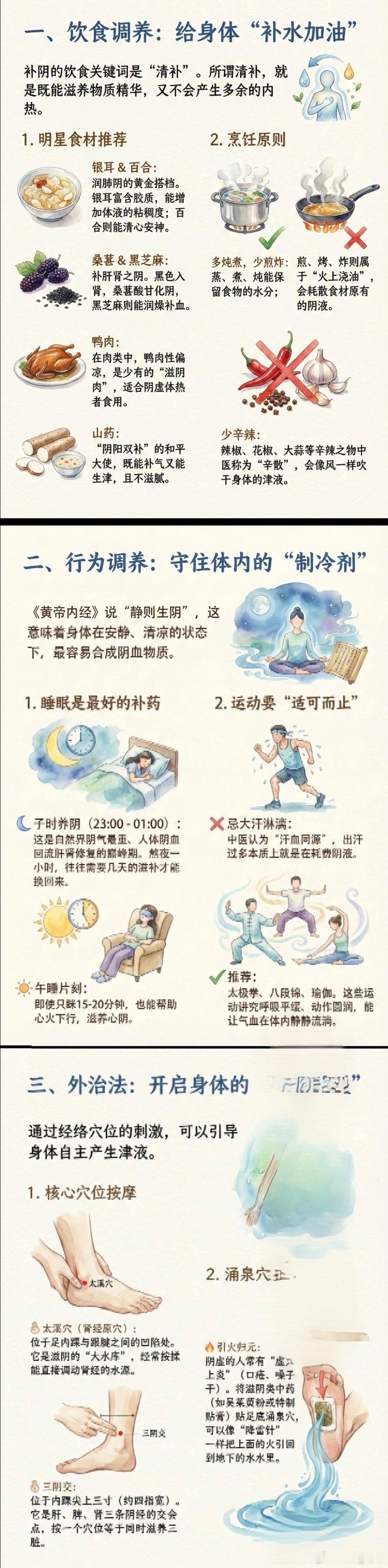 调理建议需在中医师辨证指导下进行,一般以滋阴清热、养阴生津为原则,常用方剂如六味地黄丸、沙参麦冬汤等。日常可适当食用银耳、百合、梨、山药等滋阴食物,避免辛辣燥热、熬夜耗阴。需注意,阴虚与阳虚、气虚等证型可能兼夹出现,切勿自行盲目用药。