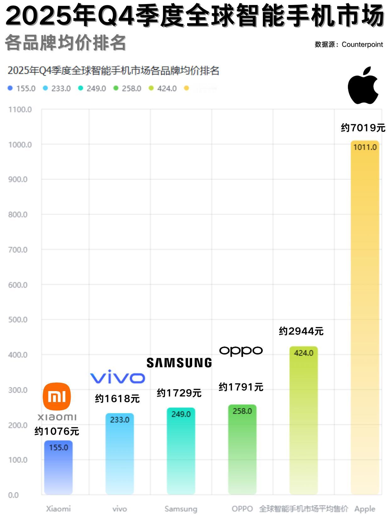 怪不得都想冲高端,你看看iPhone的均价!! 刚刷到Counterpoint的25Q4全球手机均价排名,看完直接愣住!均价对比太夸张,iPhone果然还是最高的山,凭一己之力拉高全球手机均价 不得不说,苹果这溢价能力真的强到离谱,哪怕价格这么高,买单的人还是好多,不过OPPO能拿下均价第二倒还是挺争气的,本以为会是三星的 iPhone 三星手机 oppo手机 vivo手机 小米手机 手机均价 苹果手机