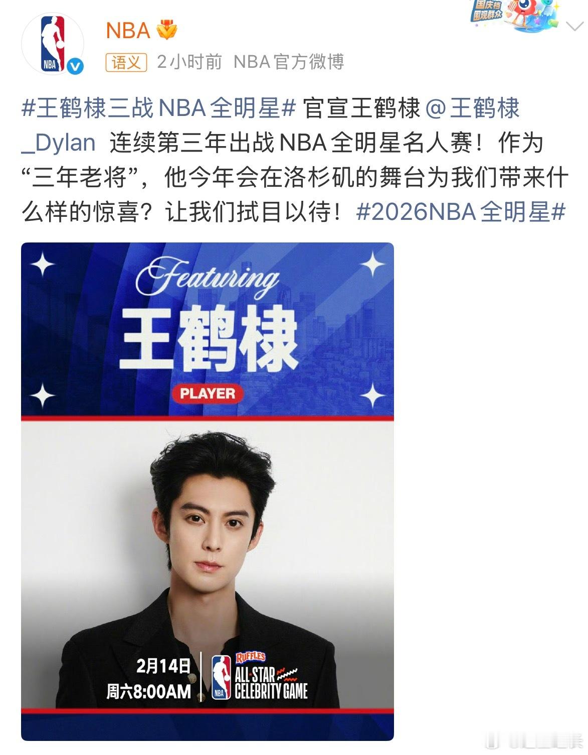 王鹤棣官宣参加NBA全明星赛王鹤棣发文官宣将第三次参加NBA全明星名人赛这是王鹤棣第三次参加NBA全明星名人赛。前两次参赛,他分别拿到18分3板1助和2分4板如今再登洛杉矶赛场,从热血新人到“三年老将”,他的每一次出征都是热爱的延续,期待棣棣在赛场上的表现