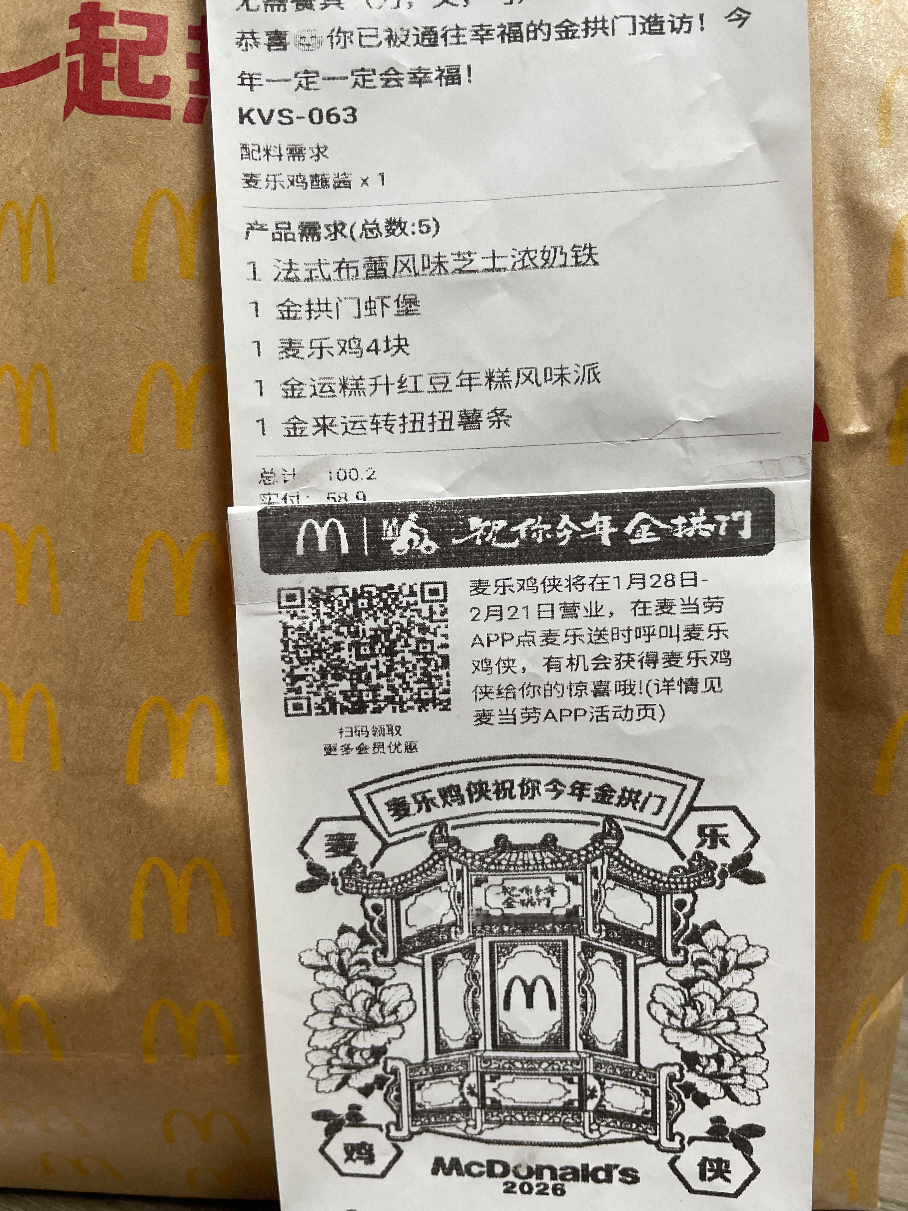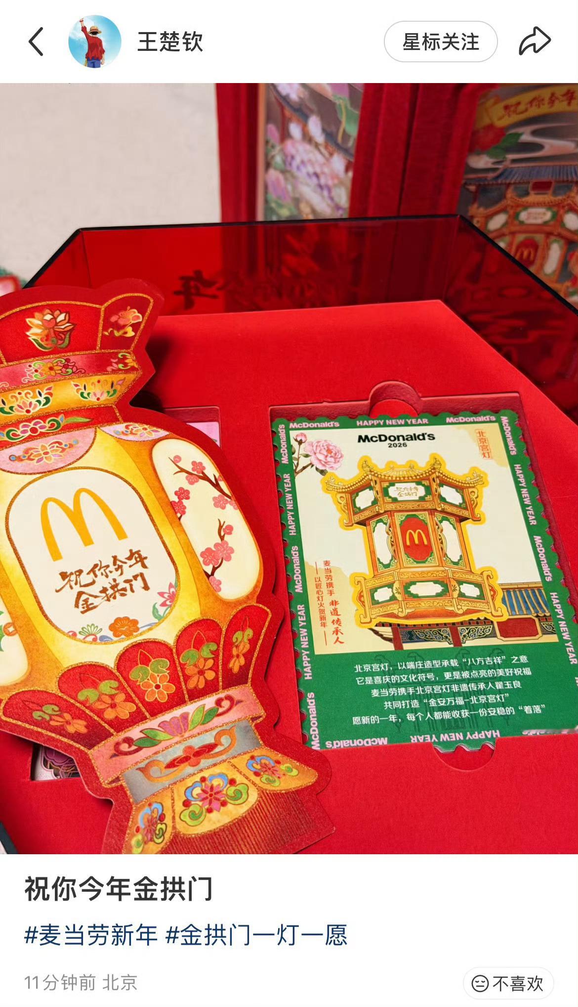 恭喜,你已被通往幸福的金拱门造访!今年一定一定会幸福!祝你今天金拱门!王楚钦麦当