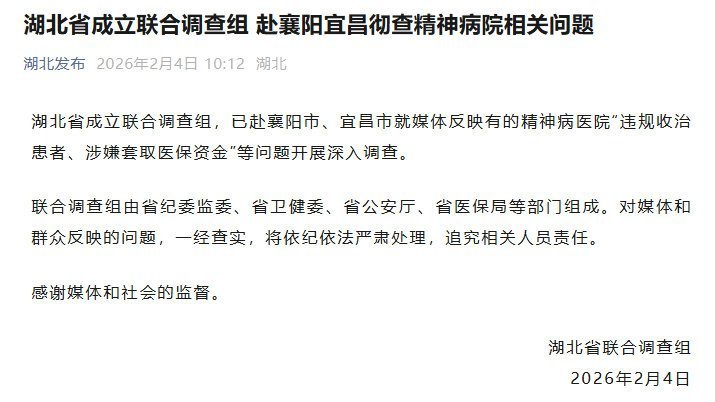 #湖北成立调查组彻查精神病院问题#【湖北省成立联合调查组 赴襄阳宜昌彻查精神病院相关问题】据湖北发布消息,湖北省成立联合调查组,已赴襄阳市、宜昌市就媒体反映有的精神病医院“违规收治患者、涉嫌套取医保资金”等问题开展深入调查。