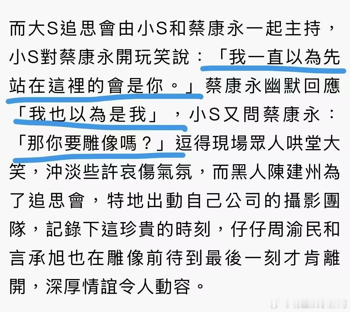 小S问蔡康永要雕像吗 在大S追思会上,小S对蔡康永开玩笑说:“我一直以为先站在这里的会是你。” 蔡康永回:“我也以为是我”,小S又问:“那你要雕像吗?” 我已经能想象到大S大喊“徐熙娣!”的语气了