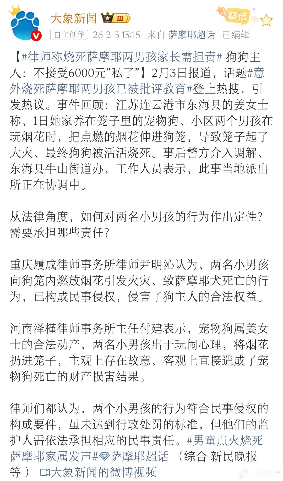 据悉,相关事件发生于2月1日,两男孩在玩烟花时点燃狗笼,导致萨摩耶被烧死。