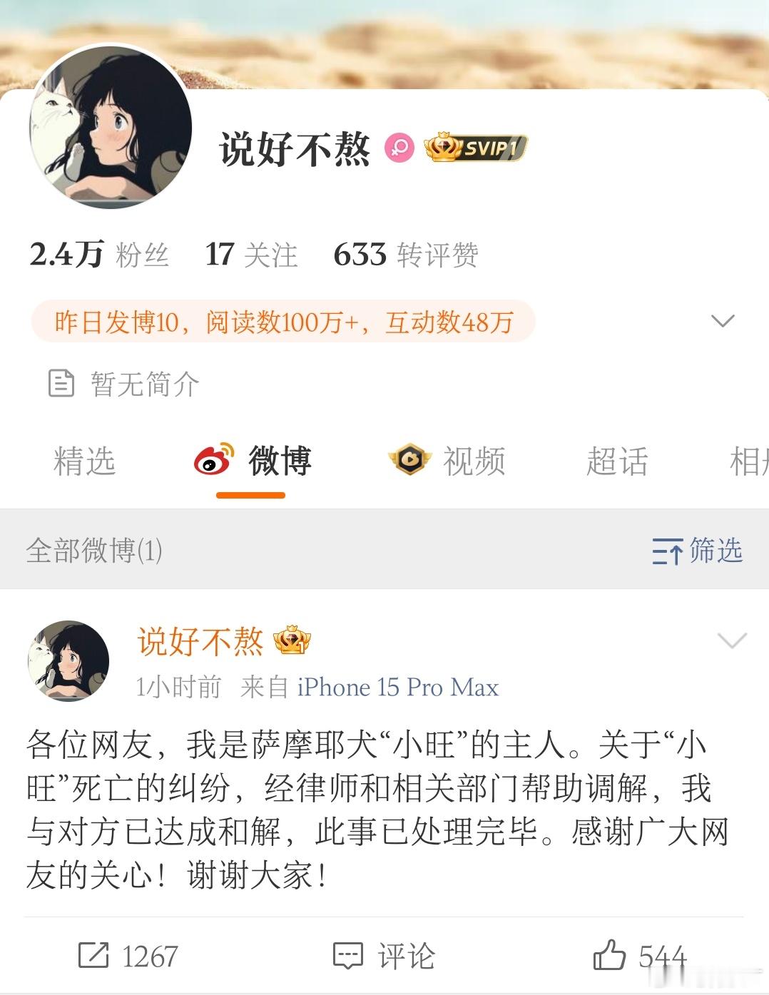 萨摩耶事件当事人发布微博称,经律师和相关部门帮助调解,她已与对方达成和解。