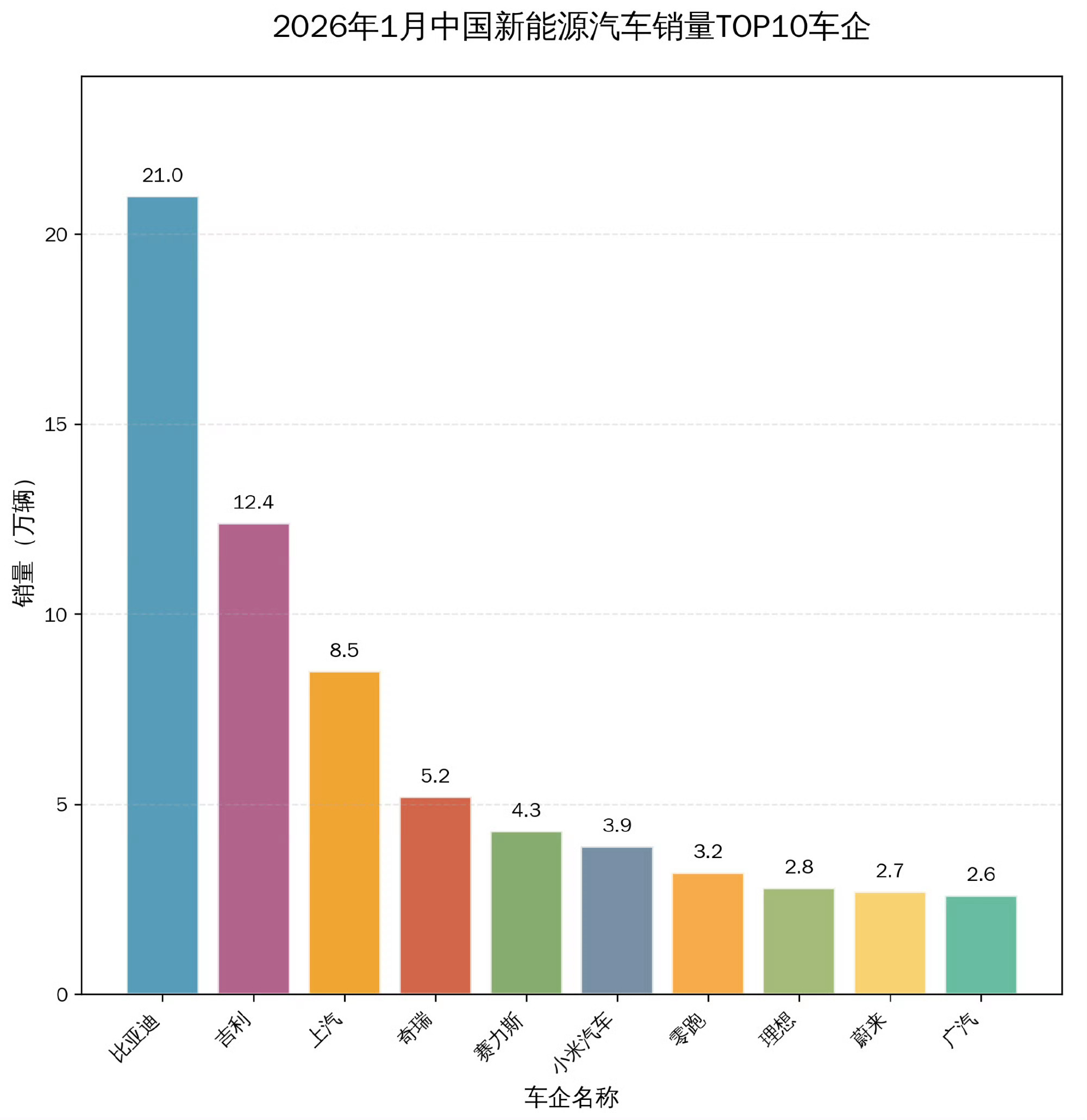 1月份汽车销量来了,还是一如既往的稳定发挥,比亚迪继续稳坐新能源汽车销冠。