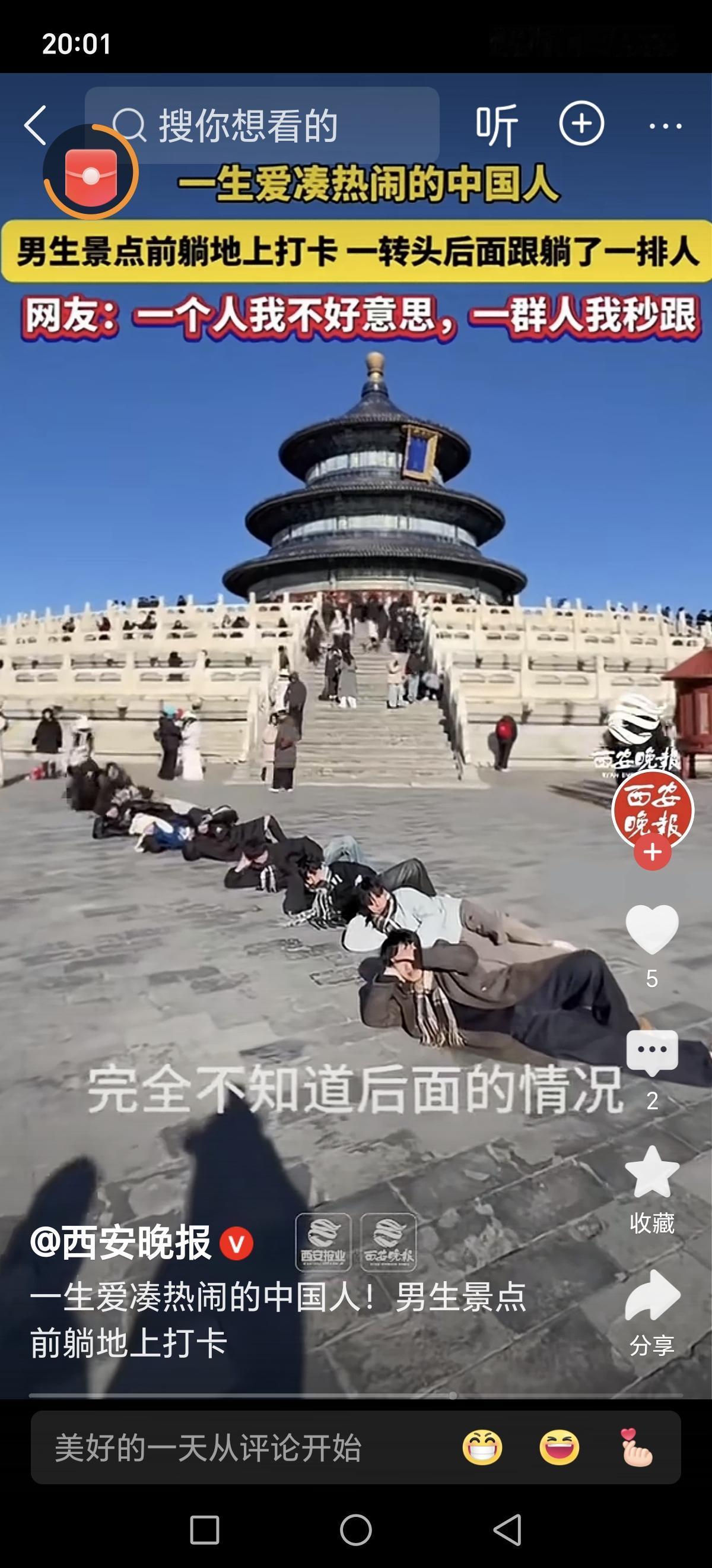 天坛门口“随地大小躺”拍照火了,背后折射出的是怎样的人性与社会心态?一场普通的旅游打卡,竟引发网络热议,甚至有人为此“炸锅”。为何在这个讲究文明礼仪的时代,一些游客却选择“随意躺”成为新潮流?他们到底在追求什么?又暴露了我们社会中哪些潜藏的价值观和心态转变? 这件事看似简单:有人在天坛门口随地躺下,摆出各种姿势拍照。有网友调侃:“这是新一代的‘地板艺术’吗?”也有人觉得这是对文化场所的不尊重,更有人直言“素质差,缺乏公共意识”。然而,换一个角度看,这背后或许藏着我们对“自由”的渴望和对传统束缚的反叛。 现代人在快节奏的生活中,似乎越来越渴望短暂的放松和自我表达。公共场合的“随地躺”成为一种“无拘无束”的方式,彰显个性,也是一种“我在这里”的存在感。有人说,这是一种“年轻人的叛逆”,也是对“规矩”和“传统”的挑战。毕竟,我们习惯了被教导要“守规矩”,但当规则变得僵硬、缺乏温度时,人们是否开始反思:难道文明就一定要压抑自我吗? 更深层次的原因,或许是我们对“公共空间”的认知变了。从“公共”到“私我”,人们的界限变得模糊。天坛,作为历史的象征,本应庄重肃穆,但在某些人的眼里,却变成了“拍照打卡”的场景,甚至成为“个性展示”的舞台。这反映出的是一种价值观的变迁:对传统文化的尊重逐渐淡化,取而代之的是“我行我素”的心态。 当然,也有网友指出:“文明不是靠规矩堆砌出来的,而是从心底尊重他人、尊重公共空间。”这句话值得深思。我们需要的不仅是硬性规定,更是每个人内心的修养和责任感。 这起“随地躺”事件,究竟揭示了什么?是文明素养的缺失?还是现代人对个性表达的追求?或者,是社会价值观在悄然变化?或许,它提醒我们:文明的底线在于尊重,而尊重,源自每个人内心那份对他人、对文化的敬畏。只有当我们都能在自由和责任之间找到平衡,公共空间才能真正成为我们共同的精神家园。天坛拍照 天坛写真