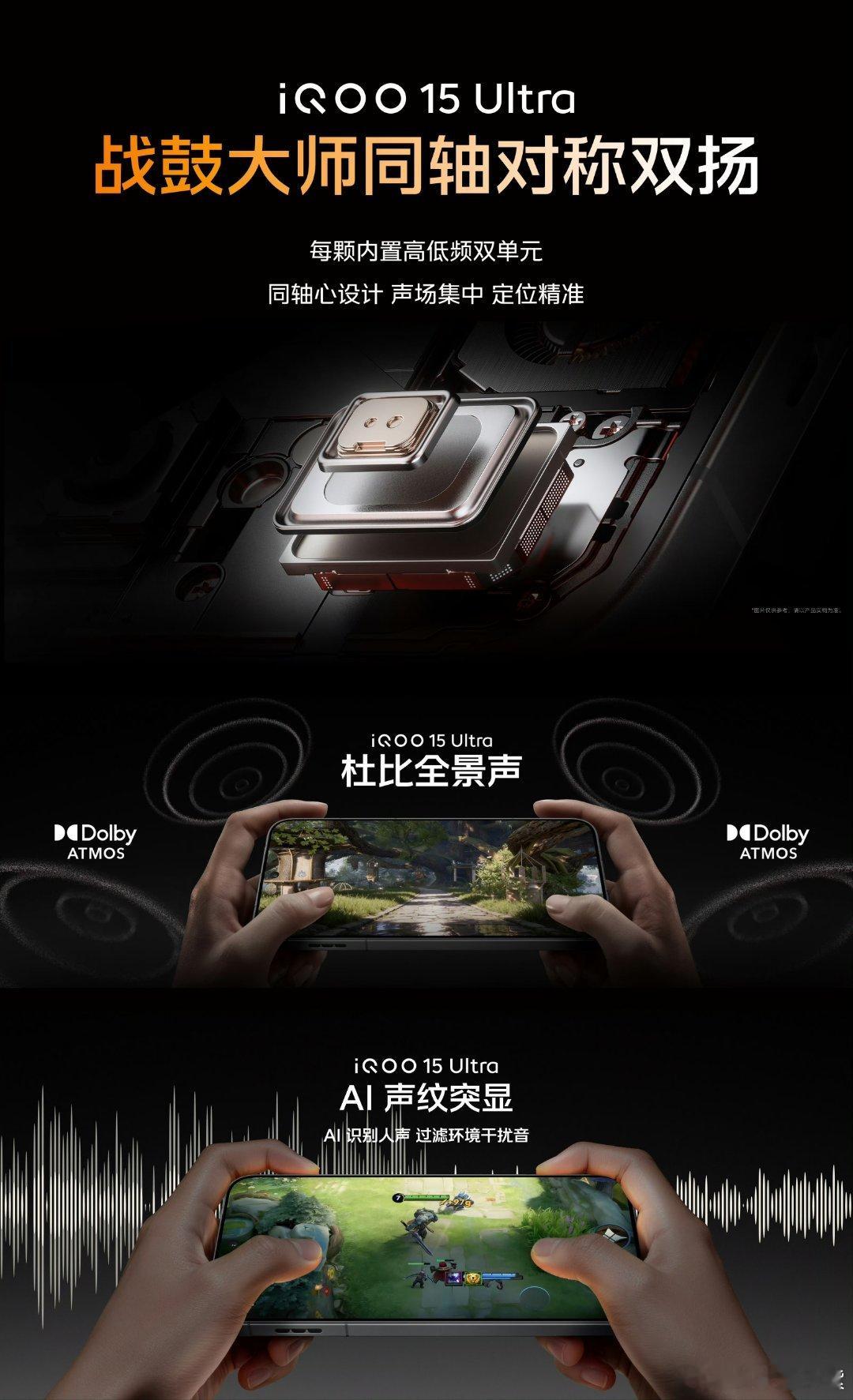 iQOO15 Ultra新品发布iQOO15 Ultra这波直接把游戏沉浸感、操控感和直播体验全拉满了,还联合《王者荣耀》搞了创作者激励计划,太懂玩家和博主们了!沉浸感这块直接封神,战鼓大师同轴对称双扬声器,一颗里面塞了高低频双单元,高音还嵌在低音中心,加上杜比全景声,三维环绕音效超顶,AI还能屏蔽环境杂音。能量光刃也超有氛围感,支持八大类通知、12种颜色调节,光效的各项参数都能自定义,还能设置拾音效果。游戏操控更是绝,超感肩键、陀螺仪、触控组成的系统直接拉高操作上限。肩键600Hz采样率,响应快到32毫秒;陀螺仪500Hz采样率加自研算法,手部小动作都能精准捕捉;触控最高4000Hz瞬时采样率,还和《三角洲行动》合作搞了分区优化,技能区、轮盘区响应飞快不宕机,操作更顺手。直播党也有福了,六大热门FPS游戏能144帧直播稳帧,团战、极限操作都丝滑不卡,还支持2K 60帧 30Mbps的高规格投屏,画质直接拉满。双WLAN加速加私有协议,直播投屏超稳定,搭配游戏直播助手,开播、录高光都超方便!