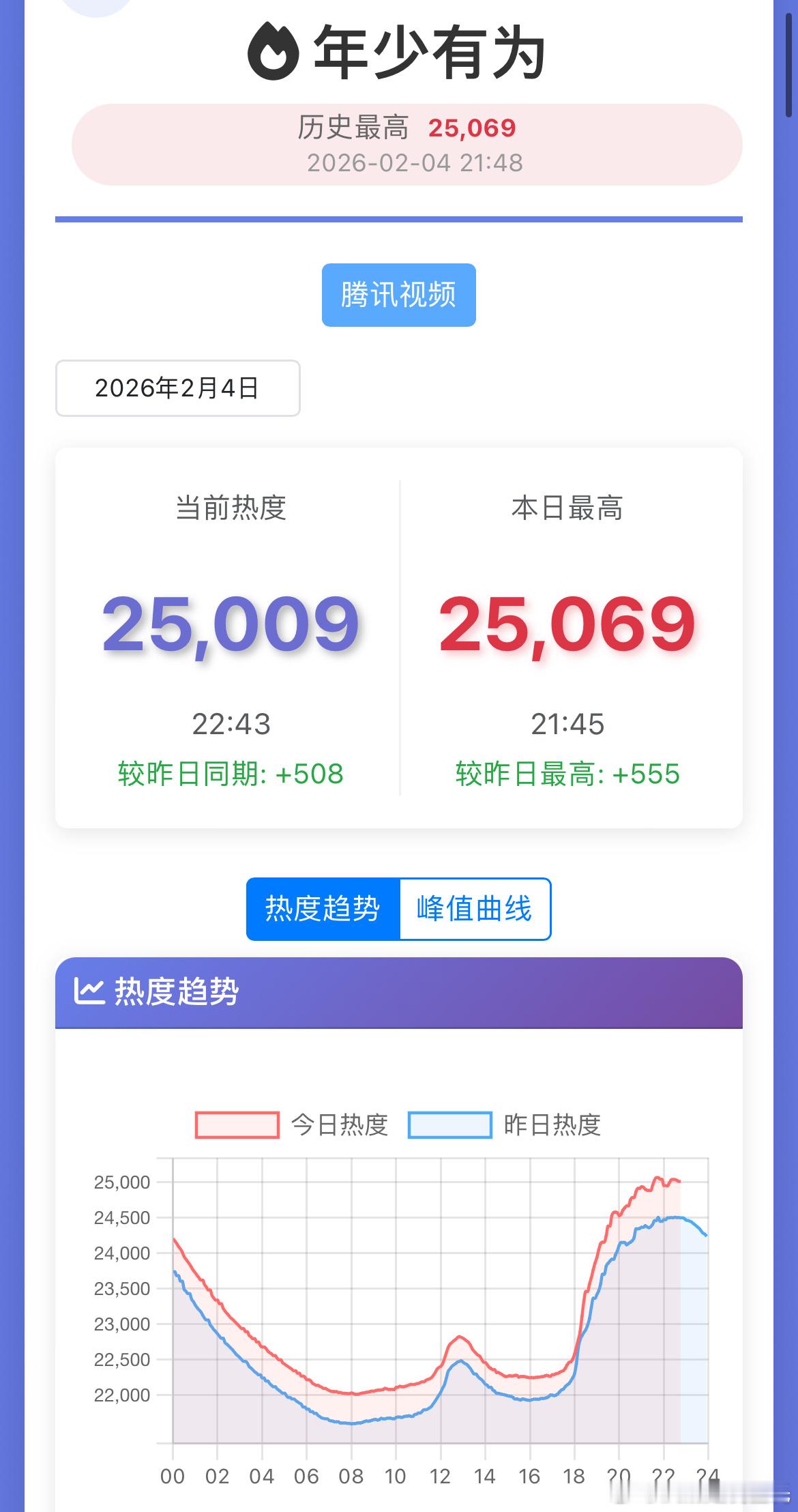 彭昱畅、林允年少有为腾讯站内热度破25000 ,最高25069,较前日涨了500+走势还可以啊~