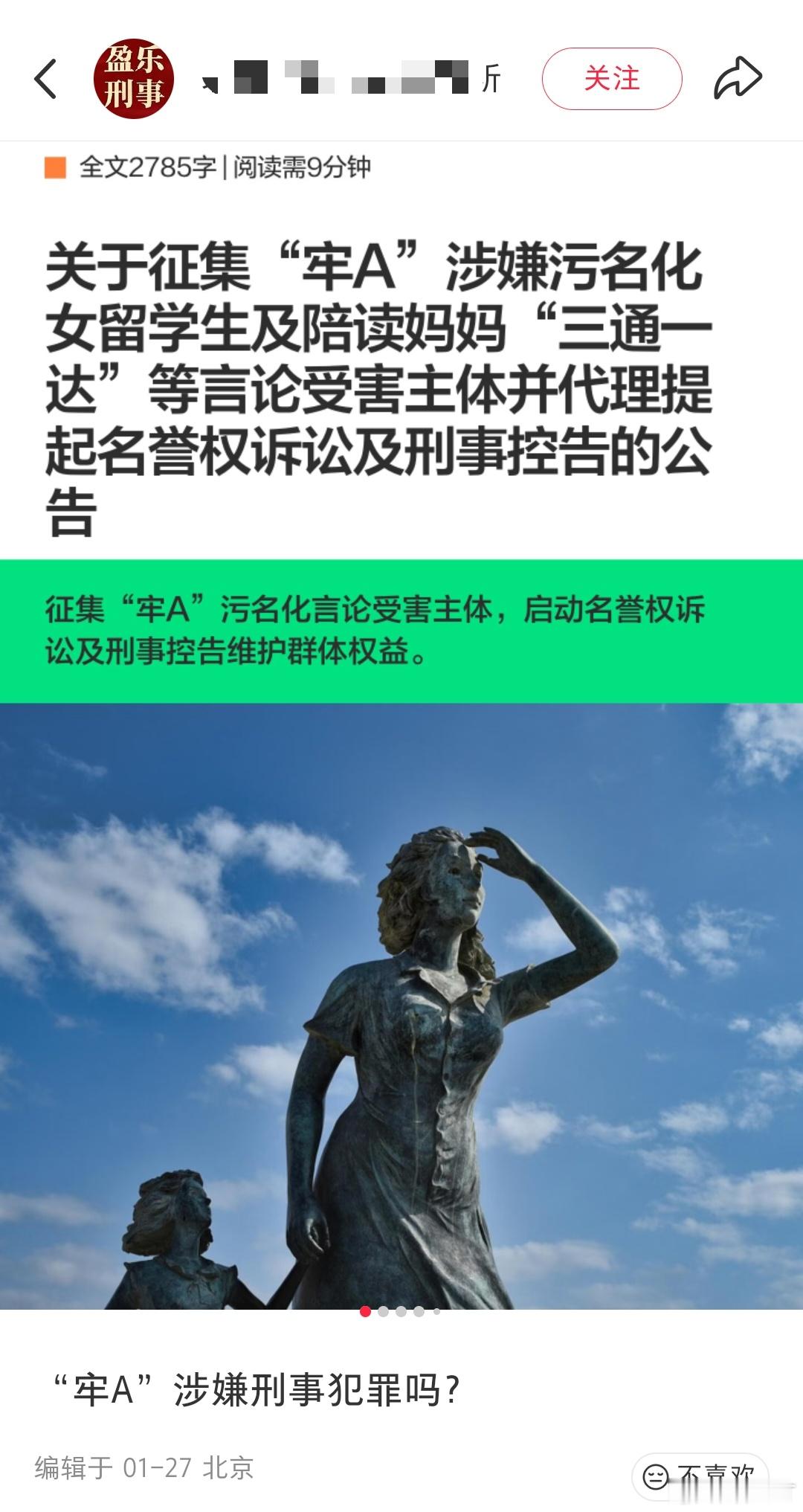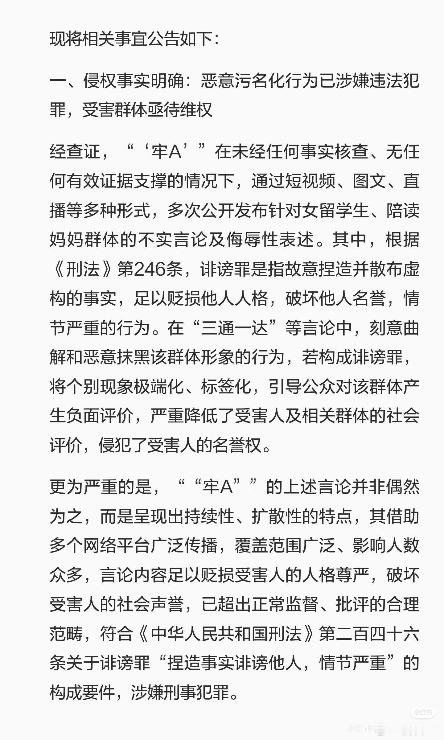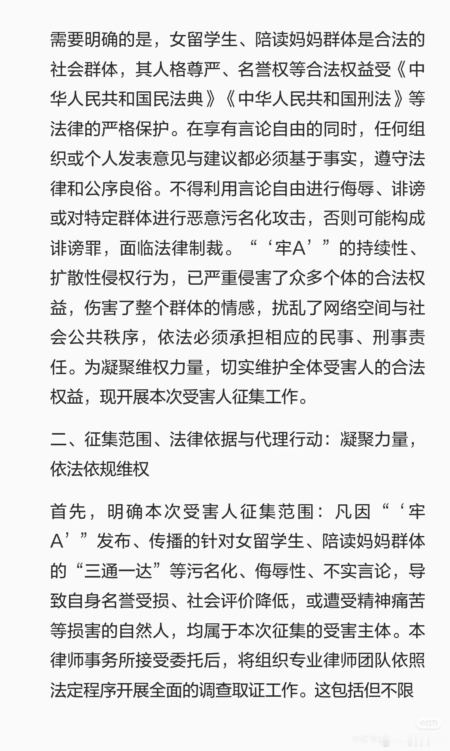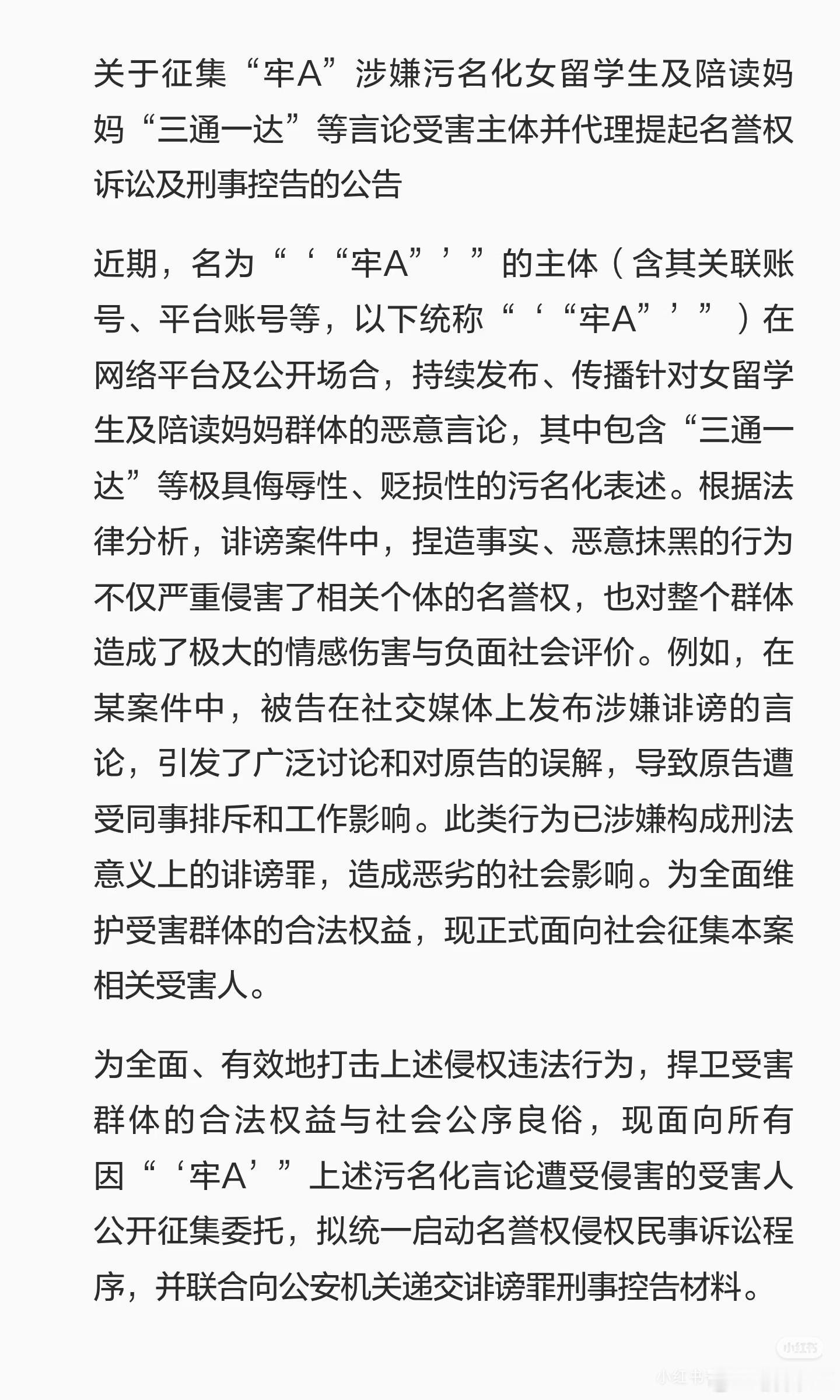 刚刷小📚的时候看到,北京某律师事务所发文称,牢A涉嫌污名化女留学生和陪读妈妈,她们想代理提起名誉权诉讼和刑事控告。