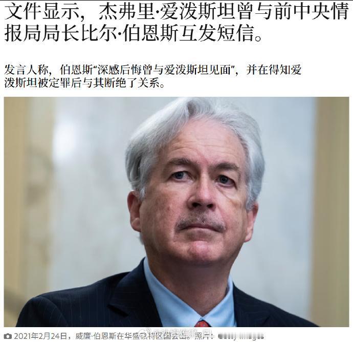 据媒体报道,新公布的爱泼斯坦文件显示,美国中央情报局前任局长威廉·J·伯恩斯长期与爱泼斯坦通信并至少两次与他线下会面。不过目前他本人表示不清楚爱泼斯坦私下的勾当,非常后悔与他交往,并表示自己在爱泼斯坦第一次暴雷后就与他断绝联系了。