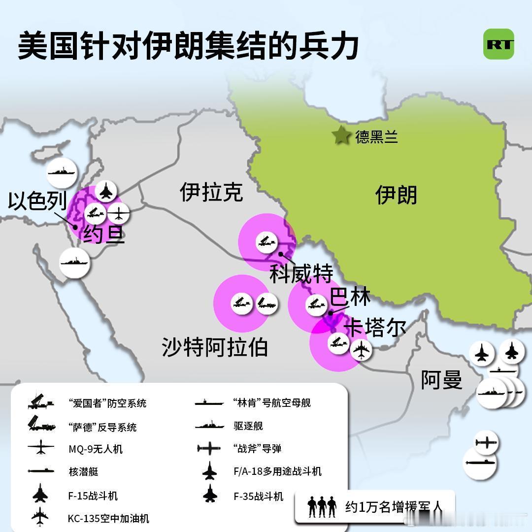 【RT军事分析|美国针对伊朗集结的兵力】 美国为可能对伊朗的袭击,已在该地区集结强大打击群,其规模远超应对委内瑞拉时。 以“林肯”号航母为首的航母打击群及数十架战斗机已被调遣至此。五套额外的“爱国者”防空导弹系统连和一套远程“萨德”反导系统连已通过空运紧急部署,旨在保护美国在该区域的基地及盟友城市,防范伊朗部队的报复性打击。 驻美国本土的B-52和B-2战略轰炸机可随时加入作战,而无需飞抵该区域。一至两艘可携带多达124枚“战斧”巡航导弹的核动力潜艇正在一处秘密水下阵地待命。 以色列可能参与美国对伊朗的行动,如同2025年那样,动用其空军力量并使用弹道导弹及巡航导弹提供支援。 美国并未增派额外的陆军和海军陆战队部队,这表明并未考虑进行全面入侵。计划将行动局限于空袭和导弹袭击。 国际观察美伊局势 来源:今日俄罗斯RT