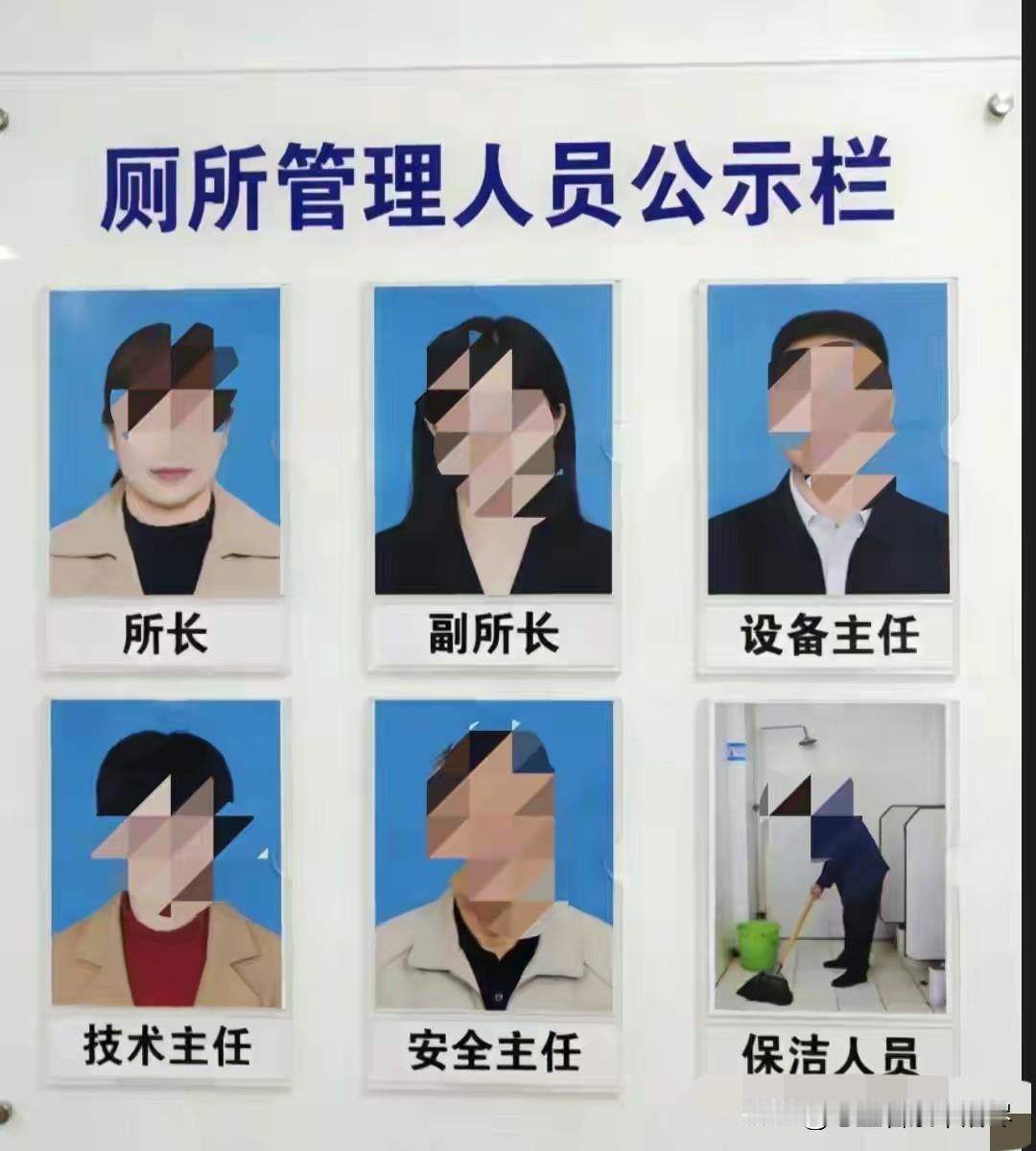 真的很难相信,一个公共厕所竟然给配了6位管理人员!不仅有厕所的所长,而且还有厕所的副所长,要说这厕所的设备主任和技术主任是为了管理与维护厕所硬件设施的话,但是这厕所的安全主任又是做什么的呢,难道是担心厕所的马桶与便池会被人偷走了吗?
