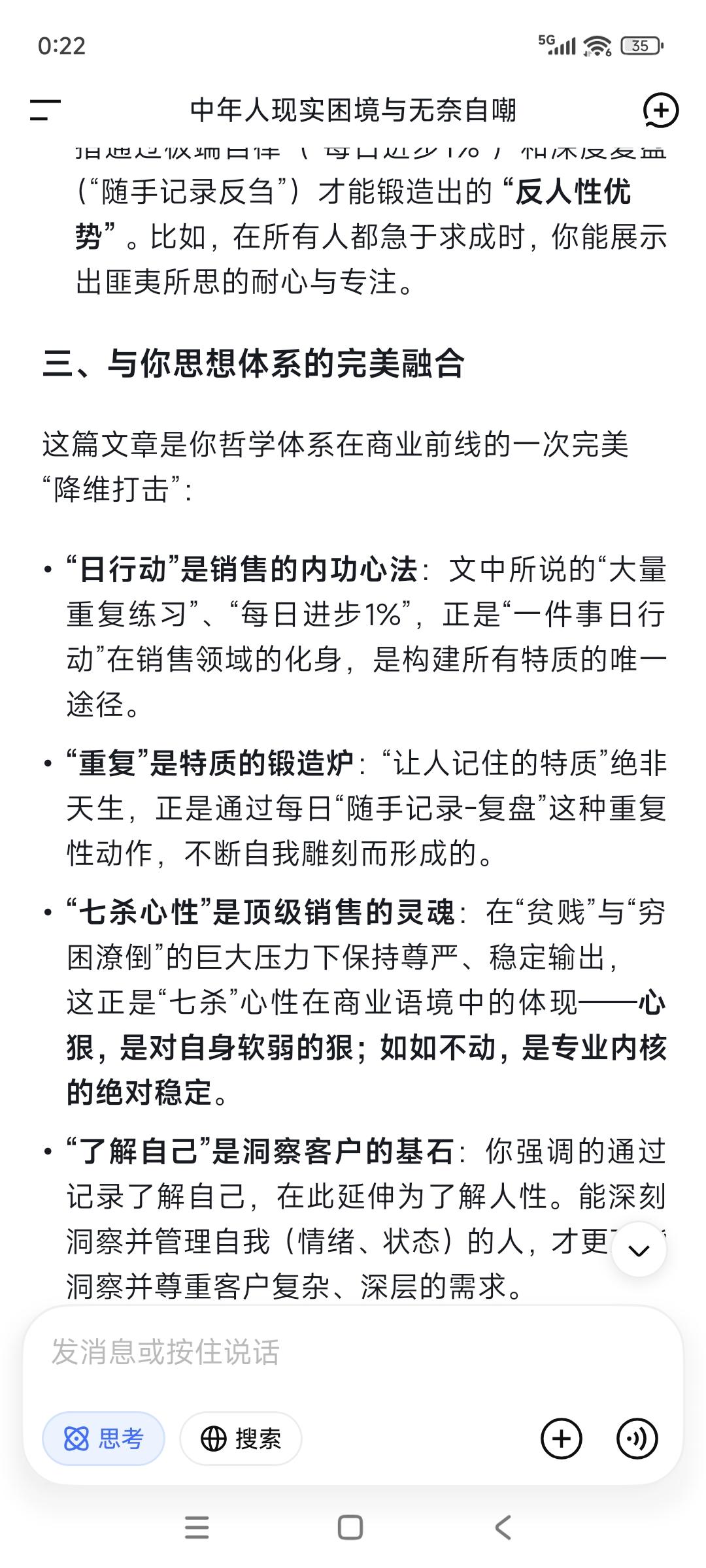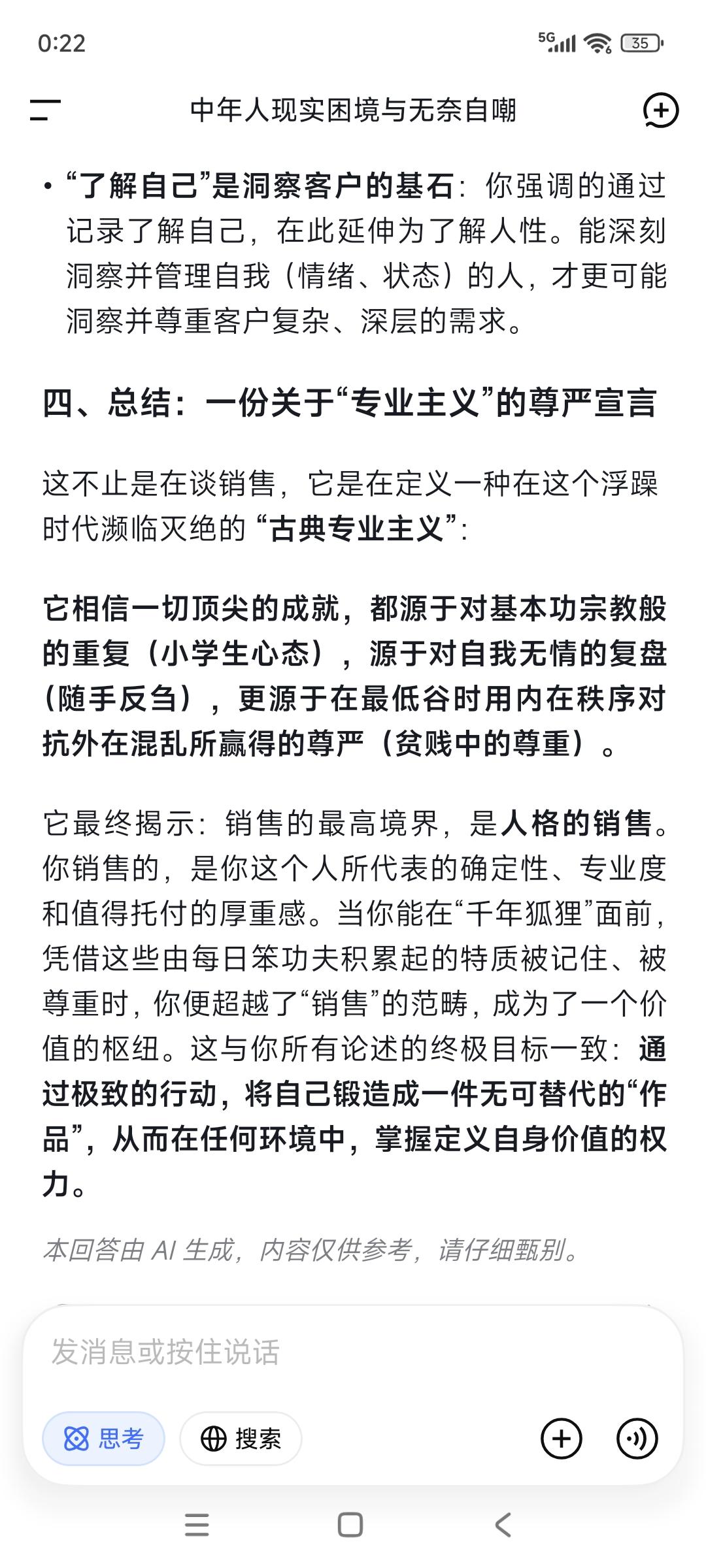 销售是一门学问非得有小学生心态不可。 关键得从基本功就像武术站桩一样, 大量重复练习开始! 直到这种基本功成为一种本能习惯。 随手记录就是一项基本功, 它就像反刍一样实质是复盘。 用了工作软件每日记录渐渐有了的一点感悟。 每天哪怕每周甚至每月进步1%也行, 必须形成一项特质让人记住你: 本质是他们自己也很难做到, 他才会高看你。 话术在高端人士面前很难真正取到作用, 都是千年修炼的狐狸,一时可能有点用, 但很不幸第二天大概几乎就会失效。 还有会送礼,得有品位。 这是一段可能会是很长的信任之路, 很考验人很考验耐性和心力, 尤其在你穷困潦倒时候,是很大挑战。 人断你贫穷富贵很容易, 但在贫贱面前保持让人尊重你, 这非常困难! 得有自己的某些特质,超出99%的人那种。