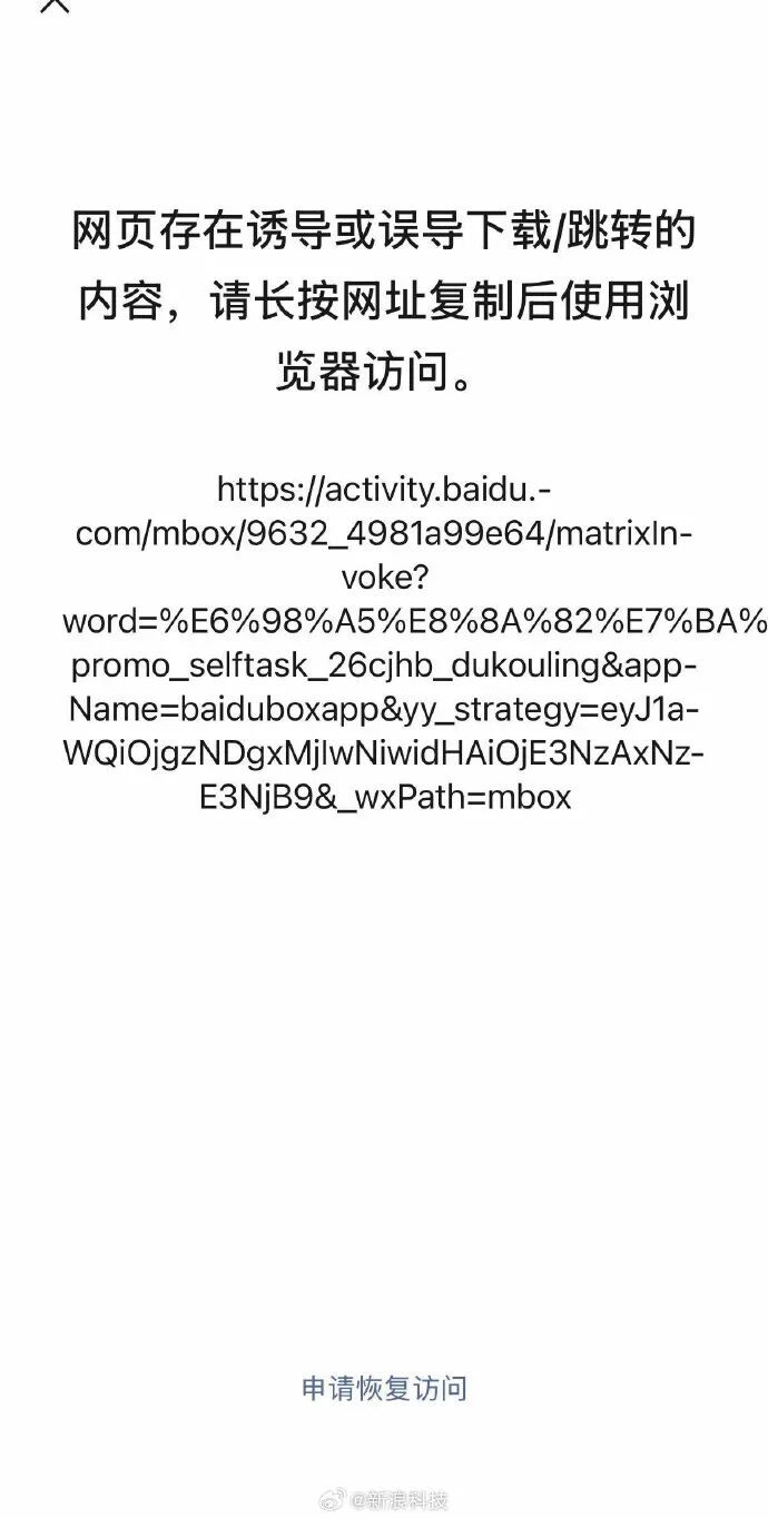 【#百度文心红包被微信屏蔽# ,已变更为口令红包】2月5日消息,继微信封杀腾讯元宝红包链接之后,百度文心助手红包分享链接也已被微信屏蔽,页面显示网页存在诱导或误导下载/跳转的内容,需要跳转第三方浏览器访问。目前,百度文心红包分享机制疑似变更为口令红包。