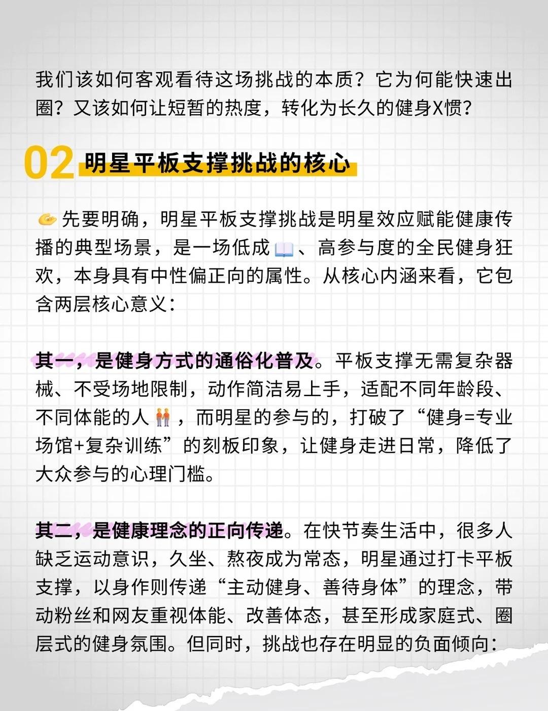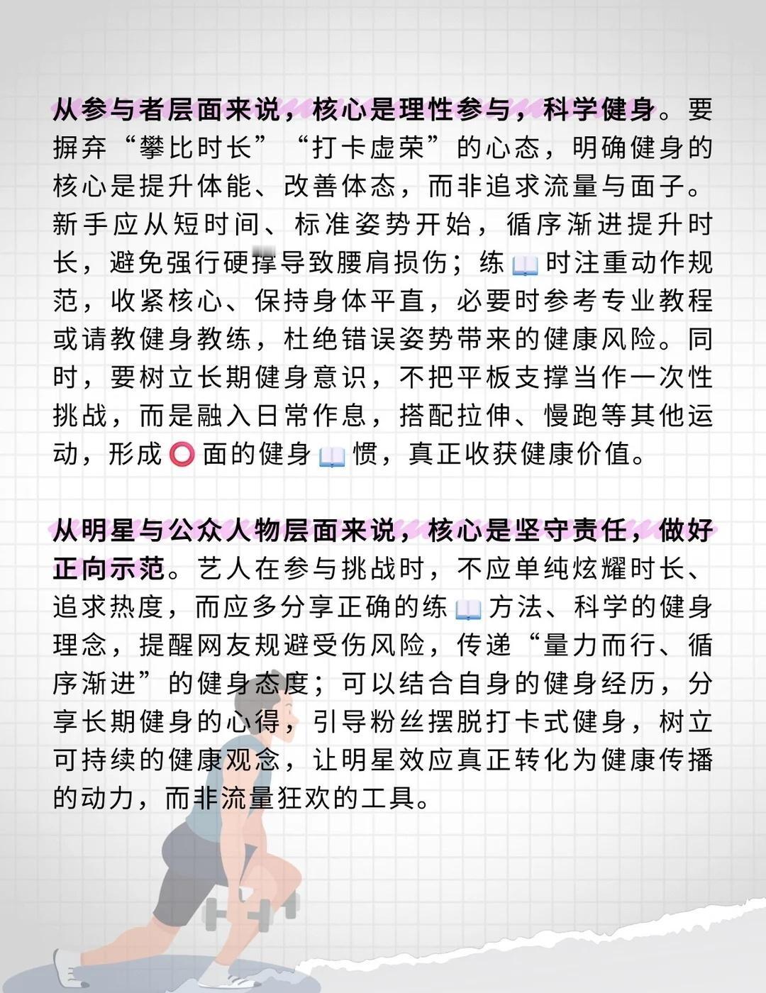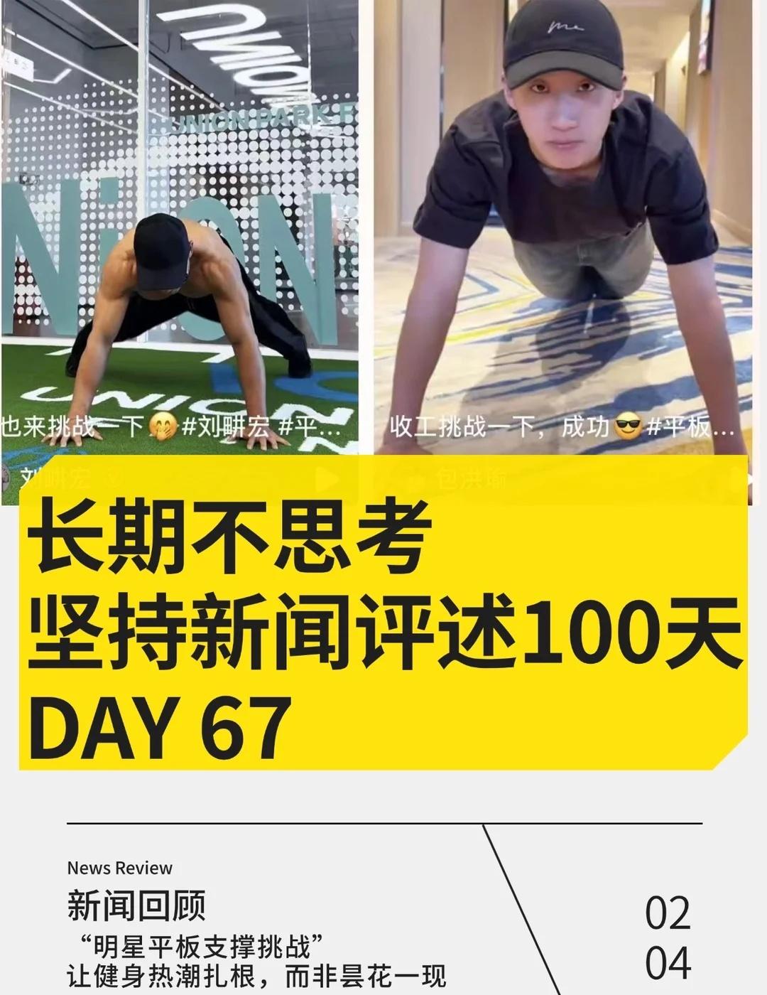 “长期不思考,坚持新闻评述100天”DAY67 当半个娱乐圈的艺人纷纷晒出平板支撑打卡视频,从几十秒的新手尝试到数分钟的耐力比拼,这场健身挑战快速席卷社交平台,带动普通网友跟风参与,成为全民热议的话题。有人跟着明星解锁正确姿势,有人组建打卡🧑🤝🧑相互督促,也有人为了攀比时长强行硬撑,甚至受伤离场。这场由明星引👔的健身热潮,本质是健康生活理念的一次大众传播,既有不可忽视的正向价值,也藏着跟风攀比的隐忧。我们该如何客观看待这场挑战的本质?它为何能快速出圈?又该如何让短暂的热度,转化为长久的健身📖惯? 新闻述评健身 社会热点 热点 即兴评述 自备稿件 传媒艺考时事热点 热点新闻事件 @开心的艺天
