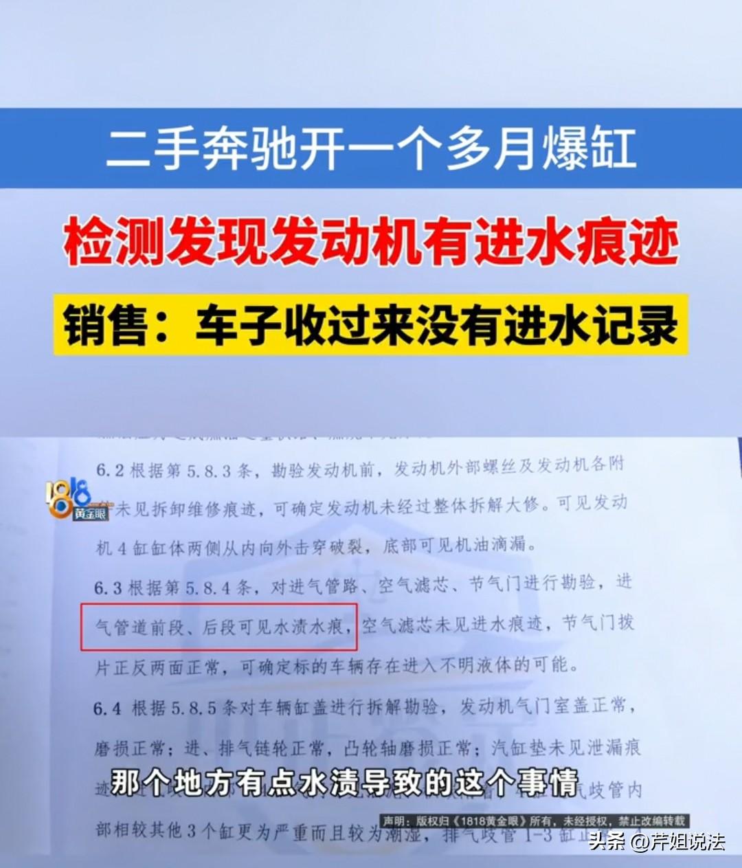 花2万!检查出了爆缸的原因,店家还是不承认!杭州,小江303000元买的二手奔驰,才一个月,发动机出现两次问题,店家说没问题,帮你维修,但是小江却觉得质量有问题,要求退和换,对此,他还拉横幅维权,还出2万元钱,找鉴定机构检查,发现发动机存在泡水问题,但是店家认为出的鉴定报告上面没写时间,你都开了一个月,万一是你自己开车的时候出现了泡水问题呢? 小江想买一辆车,权衡利弊后,还是觉得买一辆好一点的。二手奔驰最合心意。 因此,他在一家二手奔驰的精品店花三十三万买下了一辆豪车。 当时买的时候,店家就告诉他,这辆车出过事故,但是无伤大雅,就是两个门被撞了。 以前的车主不缺钱,觉得卖了买新的,于是他们才回收回来。 这两扇门呢,也是经过4S店正规更换的,但只更换了两扇门,其他没问题。所以这辆车花了30多万,小江买下了。 按道理说,30多万都可以买一辆新车了,干嘛去买二手车呢?不过小江就觉得喜欢这个款型和品牌,要是新车可不止这个价,他认为自己淘到了宝,就只换了两扇门嘛。 可是买回来后没几天,也就是2025年12月22日发现发动机在抖动,并且故障码马上就出现了。 后来赶紧联系他们,问是咋回事呢?这才几天呀?对方检查说是三缸失火,马上给它更换了火花塞,结果就好了。 小江也松了一口气,没什么大问题就行了,继续开。 可是又过了几天也就来到了2026年1月1日,刚刚启动行驶了几米,结果就爆缸了。 小江百思不得其解,这买来才不到一个月,自己都是正常使用,这次是不是不像他们所说的,只是换了两扇门? 后来他又质问店家,你们是不是隐瞒了什么?要是被我查出来了,就不只是维修了,我要退车加赔偿。 店家却说你随便查,我们收这个车子的时候,不管是保险公司的检查,还是检测站的检查、4S店的记录都只是换了的两扇门,其他都没有动过,也没有其他原因。 但是小江对他们的话不再信了,自己出了2万去找了鉴定机构检测,这也是法律指定的鉴定机构,是可以认定为证据的。 对方就发现小江车子的空气滤芯是干的,但是进气口前段是有水渍,所以认定这辆车是泡过水的。 有了这份证据后,小江理直气壮地拿着报告去找店家讨要说法。 你们这个是泡水车,干嘛卖我那么贵?并且还隐瞒事实,你们必须给我退车赔偿。 店家气定神闲地说,你这上面显示的确实是有水渍,但是没有出具是什么时候弄的,这可不排除你开车时候泡的。 小江有点纳闷呀,你这不是胡搅蛮缠吗? 直接找人来拉横幅维权,还声称自己要起诉,要求他们赔偿。 这些都做了,最后他又找来媒体要曝光对方。 但是店家还是非常冷静地说道,你尽量维权,没关系,我们支持你。 不过你把媒体找来干嘛呢?他们能解决问题吗? 我们不是早就承诺了吗?这车子即使是你自己泡了水,我们都帮你维修,还怎么样呢? 小江继续辩解,因为空气滤芯是干的,只有进气口前端有水渍,这个足以证明自己这一个月是没有泡过水的,就是店家之前泡过。 现在双方说法不一,正在走流程,大家也想看一看这个结果怎么处理。 一、空气滤芯干、仅进气口有水渍,能否证明是店家交付前泡水? 《消费者权益保护法》第二十三条第三款:机动车六个月内瑕疵争议,由经营者承担举证责任。 这个事情,水的痕迹能排除购车后涉水可能,购车不足1个月,店家无法举证泡水发生在交车后,应认定为交付前既有问题。 二、小江能否要求退车并赔偿? 《民法典》第六百一十条:标的物质量不达标,买受人可解除合同; 《消费者权益保护法》第五十五条:商家欺诈,需退车款并赔偿三倍车款。 店家隐瞒泡水车况构成欺诈,车辆无法正常使用,小江可要求退车退款,同时主张三倍购车款赔偿及鉴定费损失。 对于此事,大家如何看?素材来源1818黄金眼