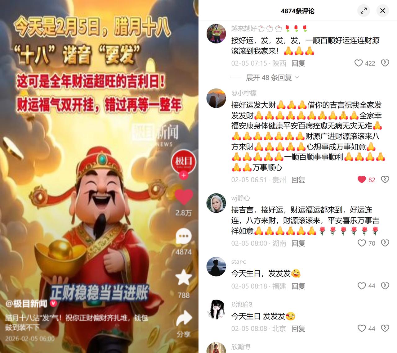 腊月十八成要发吉日,全网接好运 最近刷到不少人在说腊月十八要发,有媒体把这天包装成财运超旺的吉日,配着正财偏财齐扎堆的讨彩文案,引来一堆人在帖子底下扎堆接好运,连当天过生日的人都趁机沾喜气,把发发发挂在嘴边。 细究之下才发现,这根本不是什么传统民俗。老祖宗的腊月有自己的节奏:腊八喝粥、小年祭灶、二十八把面发,从来没腊月十八求财的说法。这纯粹是互联网语境下的人造流量梗,抓准八谐音发的大众心理,用错过等一年的话术调动情绪,低成本制造全民互动的热闹。 大伙心里也未必真信这天能发财,就是在快节奏的日子里,找个由头说出对生活的盼头,讨个廉价的心理慰藉。毕竟,谁不想日子能像嘴上喊的那样,慢慢发起来呢?