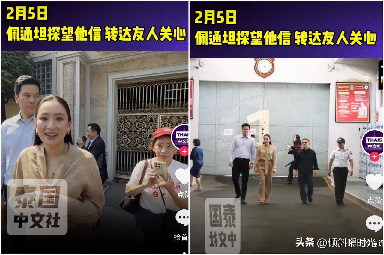 重磅消息 泰国前总理佩通坦再次带领他信家族代表前往监狱探视他信,再次对泰国即将到来的大选等政治问题绝口不提。当地时间2月5日,当天是泰国前总理他信第38次探视机会,当天他信女儿佩通坦带领丈夫皮塔卡,家属代表,律师四人一同前往监狱探视他信,探视前,他信老同学到场为他信加油打气。在探视完他信后,佩通坦接受采访时表示,他信委托她感谢大家的鼓励与支持,同时叮嘱大家保重身体,佩通坦称这次探视主要以家庭交流为主,其他政治问题以及他信特赦问题并没有做出任何回复,佩通坦最后他信目前精神状态良好,之前学习的烹饪课程将于明天结束。