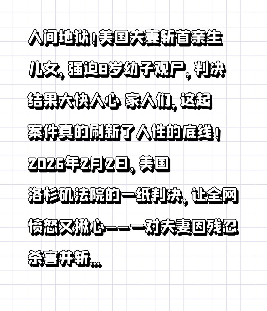 人间地狱!美国夫妻斩首亲生儿女,强迫8岁幼子观尸,判决结果大快人心 家人们,这起案件真的刷新了人性的底线!2026年2月2日,美国洛杉矶法院的一纸判决,让全网愤怒又揪心——一对夫妻因残忍杀害并斩首两名亲生子女,还强迫年幼的孩子观看遗体,最终被判处终身监禁,永远不得假释!这样的恶魔父母,简直不配为人! 事情要从2020年11月说起,39岁的泰勒和49岁的妻子布洛斯威尔,在自己家中用利器疯狂刺杀13岁的女儿马丽亚卡和12岁的儿子小毛里斯,更令人发指的是,他们竟然对两个孩子痛下杀手后,直接斩首!而这还不是最残忍的,夫妻俩转头就把当时年仅8岁和9岁的两个小儿子拖到遗体旁,强迫他们眼睁睁看着哥哥姐姐的惨状,之后又把两个幼子关在房间里,连续数日不给足够的食物,任由他们在恐惧和饥饿中煎熬。 谁能想到,这起惊天血案的曝光,竟然是因为泰勒没去上班。客户发现异常后报警,警方和消防员以燃气泄漏为由进入屋内,推开门的瞬间,所有人都被眼前的景象惊呆了——两个孩子的遗体惨不忍睹,而幸存的两个小男孩蜷缩在角落,眼神里满是惊恐,身体虚弱得连说话都没力气。当天,泰勒被当场逮捕,而妻子布洛斯威尔却连夜逃到了另一个州,直到2021年9月才被警方抓获归案。 经过长达五年的审理,陪审团最终确认两人一级谋杀罪和儿童虐待罪成立。洛杉矶检察长怒称,这是“摧毁整个家庭的怪物级残酷行为”,完全突破了人类的道德底线。2026年2月2日,法院作出最终判决:夫妻俩各自面临两个连续的无期徒刑,外加6年监禁,永远不能被假释,同时还对幸存的两个孩子下达了10年保护令,尽可能为他们隔绝伤害。 可即便恶魔得到了惩罚,那两个被迫观尸的孩子,心里的创伤可能一辈子都无法愈合。他们亲眼目睹至亲被父母残害,还遭受了非人的虐待,这段黑暗的记忆,注定会成为他们一生的阴影。而这起案件也让无数人反思:父母的身份从来不是暴力的挡箭牌,所谓亲情,更不该成为伤害孩子的枷锁。 每个孩子来到这个世界,都该被温柔以待,而不是沦为父母的“猎物”。希望这起案件能敲响警钟,让更多人关注儿童保护,也愿所有受伤害的孩子都能得到治愈,在往后的日子里被阳光包围。 你怎么看待这对夫妻的残忍行为?你觉得该如何更好地保护孩子免受家庭伤害?评论区聊聊你的看法,点赞转发让更多人重视儿童保护!