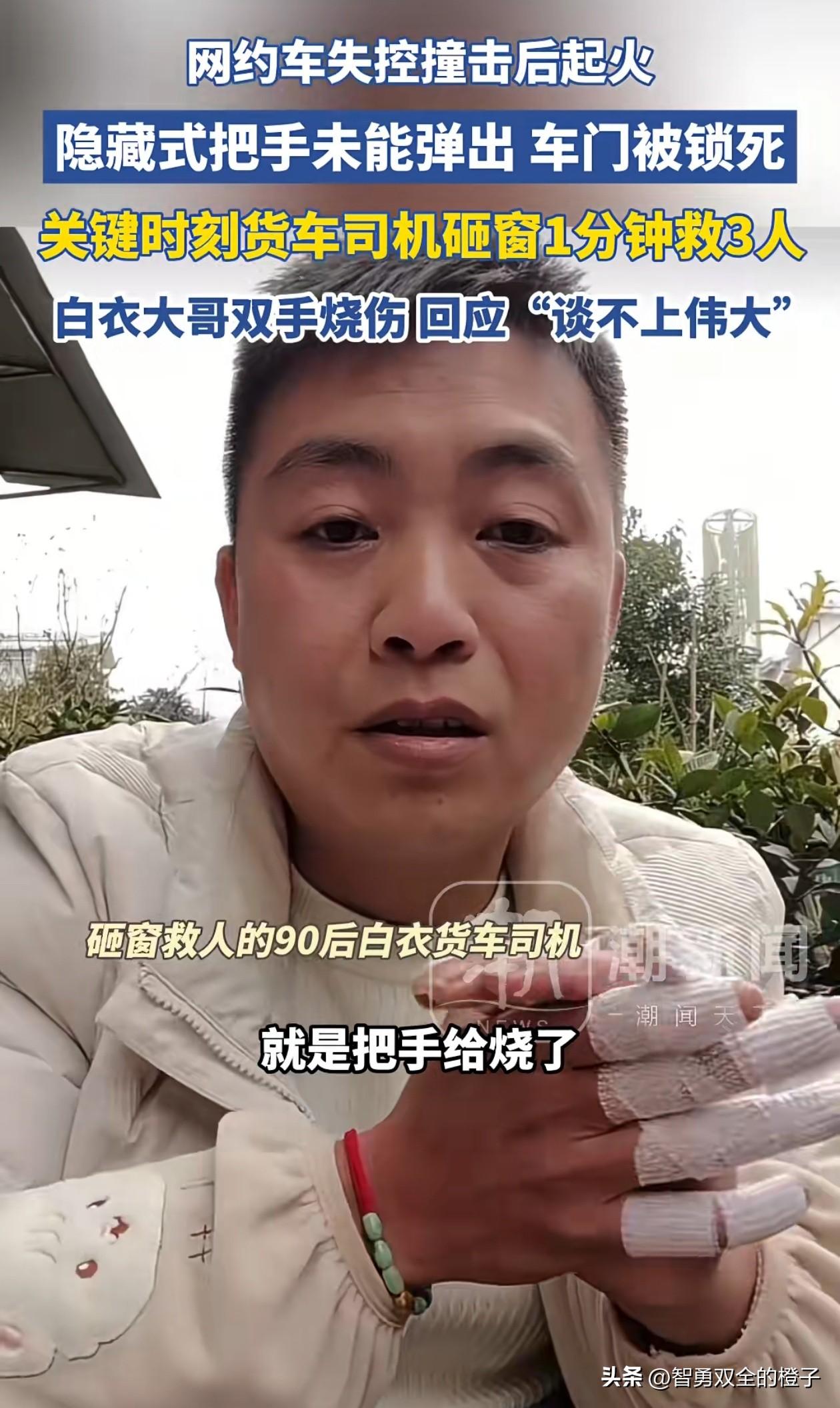 云南一网约车失控撞击起火,副驾1人遇难,后排乘客3人获救,救人司机透露更多! 2月4日,云南一辆网约车行驶过程中突然失控撞向路边,车门从外部无法打开,幸好路过的货车司机挺身而出,捡起石头砸窗救人,与轿车驾驶员合力救出3名乘客,但副驾乘客不幸遇难。 从左上角的监控时间可以看到,车辆打滑到冒出浓烟,不到40秒,大概又过了10多秒,整辆车就燃起来了,给人的反应时间太短。 救人的白衣男子一名货车司机,当时正好路过那里,大哥双手被诊断为三度烧伤,男子说,他已经尽力了,可惜没能救出副驾驶的人。 暂时不知道是啥原因导致车辆失控,但也给大家提了个醒,开车还是要慢点,安全第一,特别是电车!