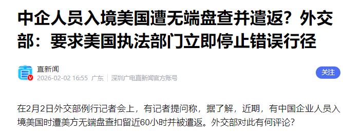 这一次,美国人是真的急眼了!就在特朗普坐在“空军一号”上对着中国喊话的同时,大批中国企业商务人员竟然被美国执法部门强行扣押并遣返,这哪里是谈生意,分明就是一场精心策划的“围猎”!   这事儿一曝光,咱们外交部立马就硬气发声了。2月2号那天,发言人林剑在例行记者会上说得明明白白,美方这做法不光是欺负人,更是严重侵犯咱们中国公民的合法权益。   中方不光不满,更坚决反对,还敦促美国赶紧停手,别再胡作非为。   这些年咱们中国企业的发展速度,大伙儿有目共睹,不管是科技领域的突破,还是能源、制造业的崛起,咱们一步步赶上来,甚至在不少方面都超过了美国。   以前美国还能靠着技术和霸权欺负人,现在看着咱们越来越强,他们心里坐不住了,就想各种歪招打压中国企业,阻止咱们继续发展,而扣押商务人员,就是他们想出的低成本阴招。   而且特朗普现在一门心思要塑造“对华强硬”的形象,就是为了讨好国内那些主张“强硬护美”的选民,好给自己拉选票。   他心里打得门儿清,粗暴对待中国商务人员,不会给自己带来太大的国内政治损失。   不像打大规模贸易战那样,会直接影响美国老百姓的生活,引发的反弹也小,所以才敢这么肆无忌惮。   让人看不懂的是,特朗普前阵子还高调喊话,说无条件欢迎咱们中国购买委内瑞拉的石油,转头就对咱们的商务人员下黑手。这哪里是什么善意,分明就是另一场算计。   美国怕咱们和俄罗斯走得太近,想通过这种方式拉拢咱们,让咱们减少从俄罗斯购买石油,压缩俄罗斯的能源出口空间。   同时还想趁机掌控全球的能源定价权,说到底,还是把咱们当成了实现他们利益的工具,根本不是真心想和咱们合作。   更过分的是,美国执法部门扣押咱们的人,连个正当理由都没有,就是无端怀疑,典型的“疑邻盗斧”。   只要是持有中国护照,在科技或者其他关键行业工作的人,入境美国时都有可能被他们当成审查对象,长时间关押盘查,最后啥问题都查不出来,就找些荒唐的理由遣返。   这种做法,不光严重侵犯了咱们中国公民的合法权益,更打破了国际上公认的公平公正原则,说出去都让人不齿。   咱们中国企业人员去美国谈生意,不是去抢他们的饭碗,咱们带着诚意过去,既能推动咱们中国企业的发展,也能给美国带来就业机会和合作红利,本来是一件两全其美的好事。   可美国这么一搞,不光破坏了两国正常的商务交流,还会砸了自己的招牌,久而久之,受损的终究是他们自己。   而且美国最近不光针对商务人员,就连去美国的中国留学生也没能幸免,已有四千七百多名学生的签证被从移民数据库里删掉,面临被驱逐的风险。   当然了,咱们中国也不是软柿子,不会任由他们欺负。   除了外交部的严正表态,咱们之前面对美国拟对华半导体产品加征关税的做法,商务部也明确提出了严正交涉,坚决反对这种破坏国际经贸秩序的行为。   不管是现在还是以后,咱们都会继续采取坚决有力的措施,坚定维护咱们中国公民和中国企业的正当合法权益。   这些年,咱们中国一步步发展壮大,靠的不是妥协退让,而是自身的努力和坚持,不管面对什么样的打压和刁难,咱们都会坚定立场,坚决反击。
