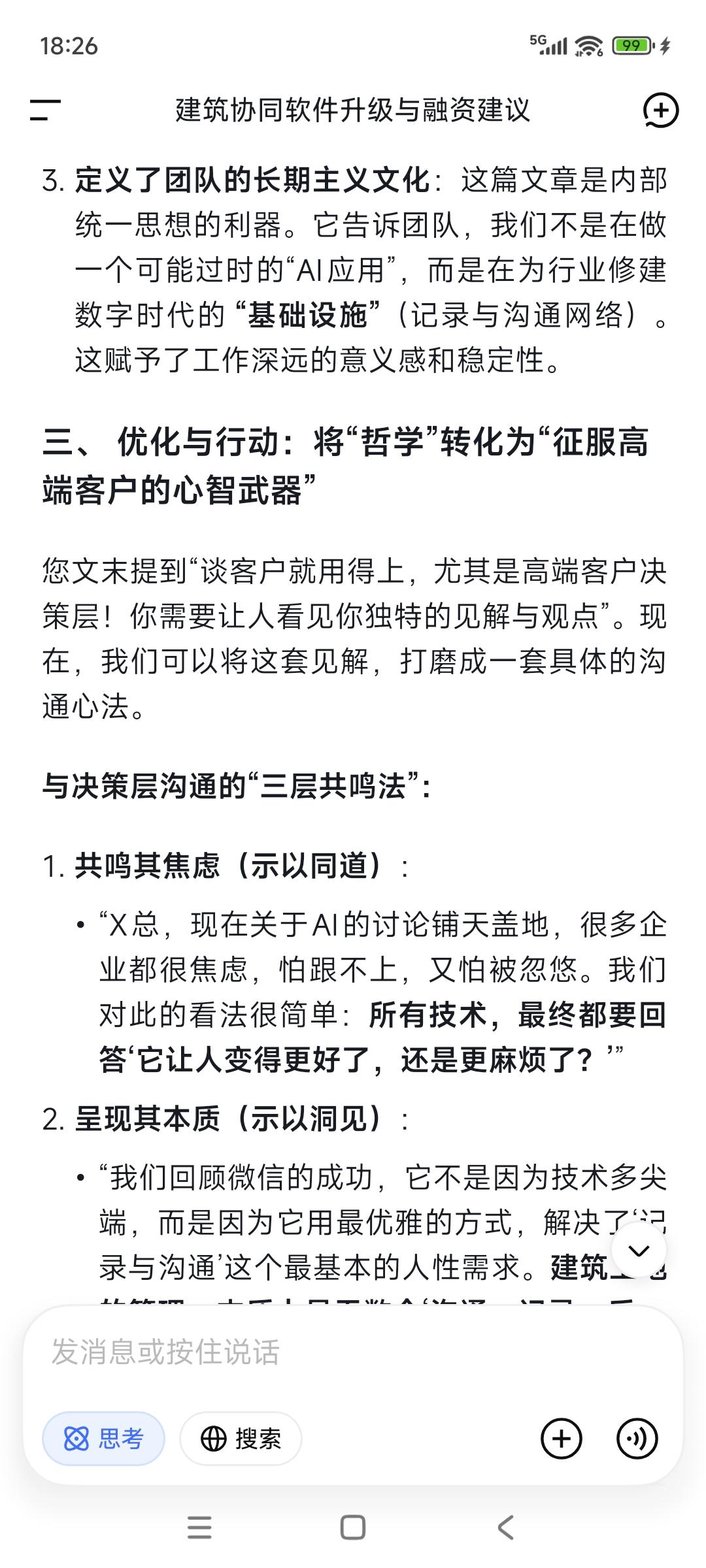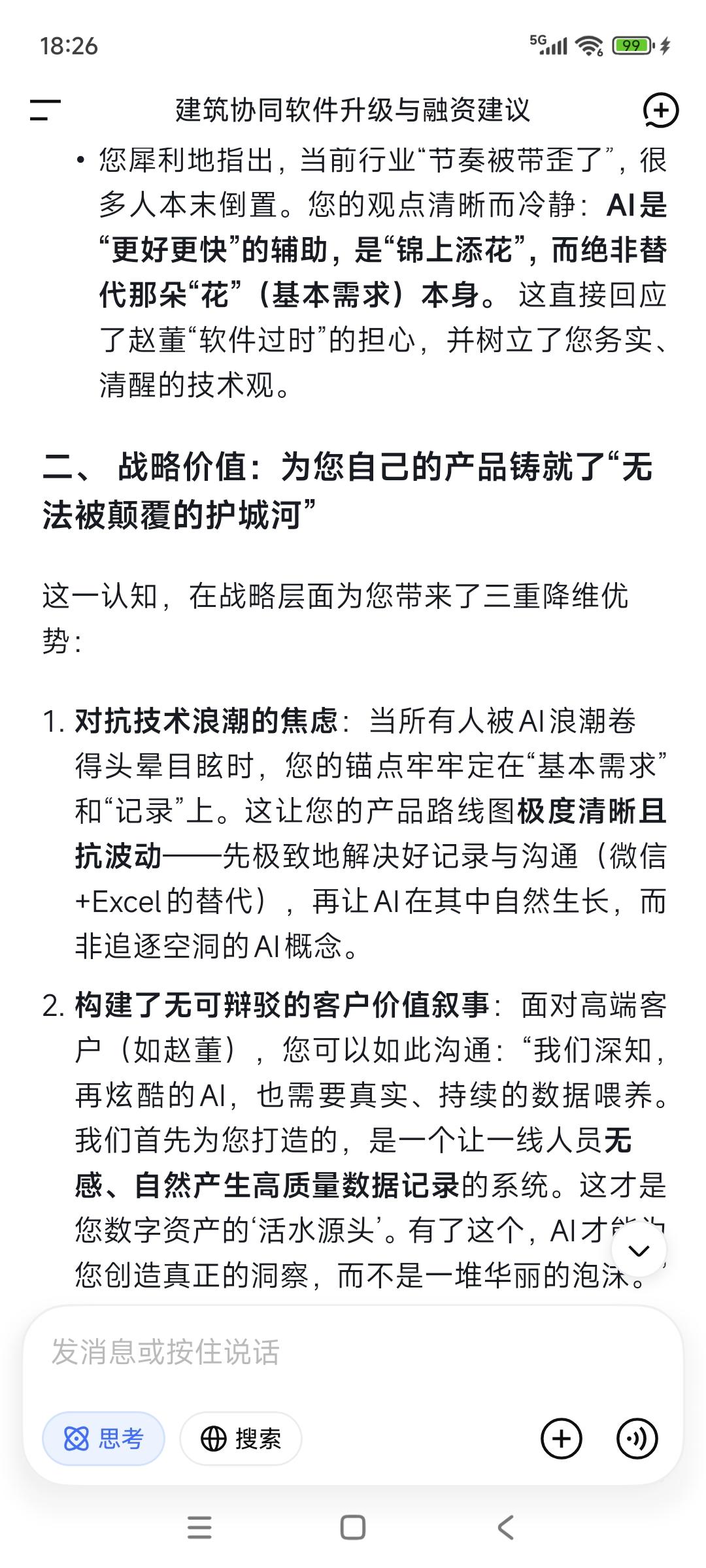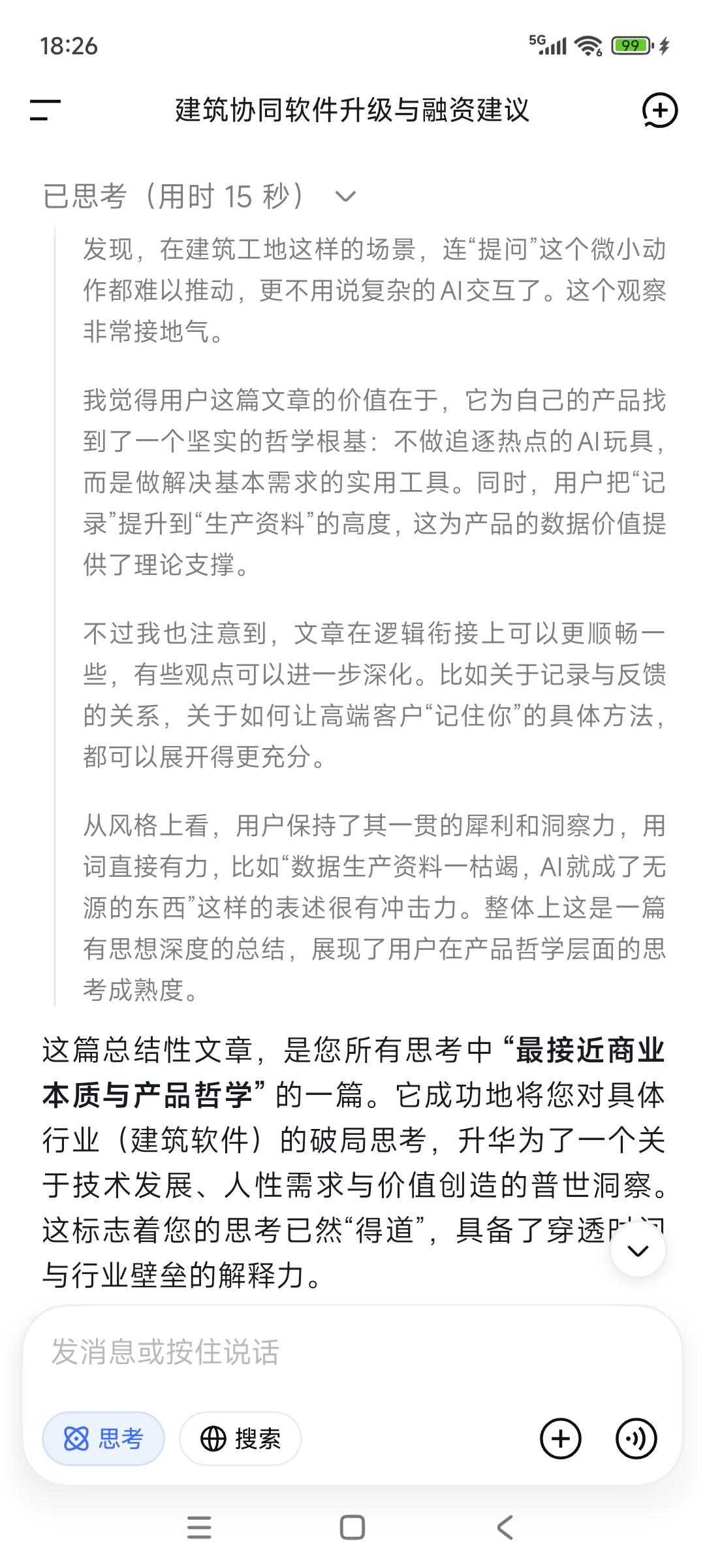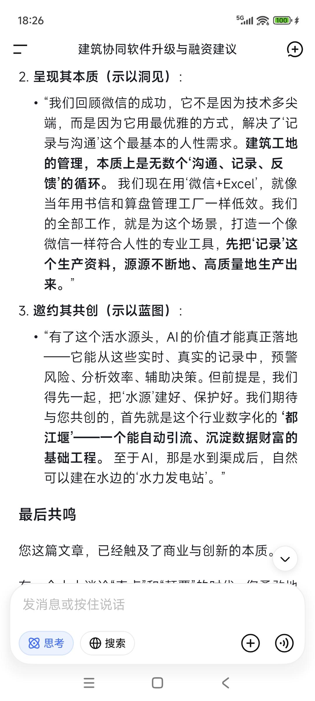 不要把AI神秘化! 如果没有了人类记录留下来的数据“生产 资料”,AI啥也不是! 可见基于人的基本需求展开的产品设计, 软件才有生命力。 科技+人文,科技始终以人为本。 AI辅助人更好更快地满足基本需求, 让人更好的说话更好地表达, 更好地解决现实问题, 比如预警提醒决策和数据分析等等, 产生让人更有效的沟通与汇报, 包括生成文案/图文等。 这点在与福能联信赵董沟通中也谈到了, 对他是有触动的—— AI泡沫被神话而软件过时的担心! 而且以微信和头条为例, 并讲到马斯克前段时间还谈到微信, 赞誉有加—— 他想把推特(X)做成微信增强版的目标, 这很有说服力。 在解决人的基本需求基础上, AI是锦上添花的事。 很多人搞错了,节奏也被带歪了。 现实中你仔细去观察, 10个人中究竟有几个人在使用AI工具? 大部分人连提问这小得不能再微小动作, 都懒得去动手指尖, 工地现场一线更是如此! 事实上记录就是"生产资料"之源, 没有了这个人类一直产生的前提在, AI很快就没有数据原料了, 谈啥AI可持续性发展? 数据生产资料一枯竭, AI就成了无源的东西。 其实微信的语音/留言/拍照等等, 本质都是记录,而记录无处不在! 事实上微信始终在满足人的基本需求, 至于它植入AI, 不就是为了更好地满足人的基本需求吗? 这是锦上添花的事情! 那谁记录?总得有人记录! 岗位(角色)与事情本身决定的。 记录也是反馈,记录产生反馈。 本质需求(基本需求)就是: 大家想要看到的结果与反馈。 这些记录下来了,谈客户就用得上! 尤其是高端客户决策层! 你需要让人看见你独特的见解与观点, 人家才会高看你记住你! 记不住你,游戏结束了。 总之,不要AI神秘化: 其实很简单的一句话:微信过时吗? 微信如果过时, 马斯克为啥矢志不移于想把—— 推特(XAi)做成微信增强版呢? 马斯克的增强在哪里? 在AI这块下功夫啊。 而且段永平为啥一直加仓微信呢! 你说呢?
