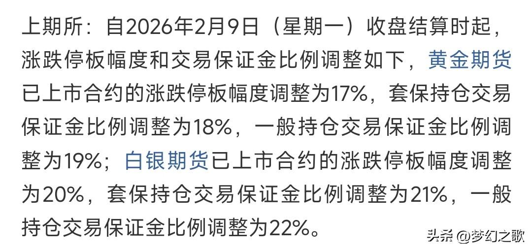 黄金交易保证金一调再调,贵金属再遭利空消息 为了抑制黄金,白银的炒作,上期所也是操碎了心,保证金一调再调,最新消息,下周开始黄金保证金上升到18%,白银保证金上调到22%。 不要小看这增加的1%,1%的保证金可能就是对应万亿的成交量,对应的就是黄金,白银市场的流通性,流通性下来了,成交的热情当然也下来了。 今天有色金属板块暴跌4.92%,肯定也跟这个新的规定有关,现在看村里压黄金白银的热度是铁了心了,如果成交量还下不去,那可能还要加。