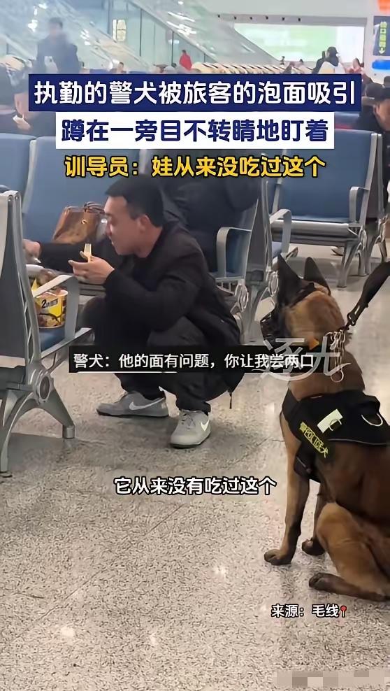 “笑不活了!”2月1日,陕西西安,一男子在火车站候车时,觉得有点饿,便泡了桶泡面吃,没想到路过的警犬闻着味后,直接蹲在男子面前,被香的走不动道,看的男子直接笑了出来,一旁的训导员只能尴尬解释,它没吃过这个!网友:看给孩子馋的! 谁能想到平时勇猛干练的警犬,遇上泡面香味也秒变馋宝宝。男子候车泡了桶面,香味一散,路过的警犬立马定住,任凭训导员怎么示意都不动,满眼都是对泡面的渴望,把男子都逗笑了。 警犬日常训练严苛饮食规范,从没尝过泡面这种人间烟火味,这份纯粹的馋太真实了。原来再威风的工作犬,也有被美食拿捏的时刻,严肃和软萌切换,瞬间让人觉得超亲切。 这也能看出警犬的可爱一面,打破了大家对它高冷勇猛的刻板印象。你见过警犬哪些可爱瞬间?