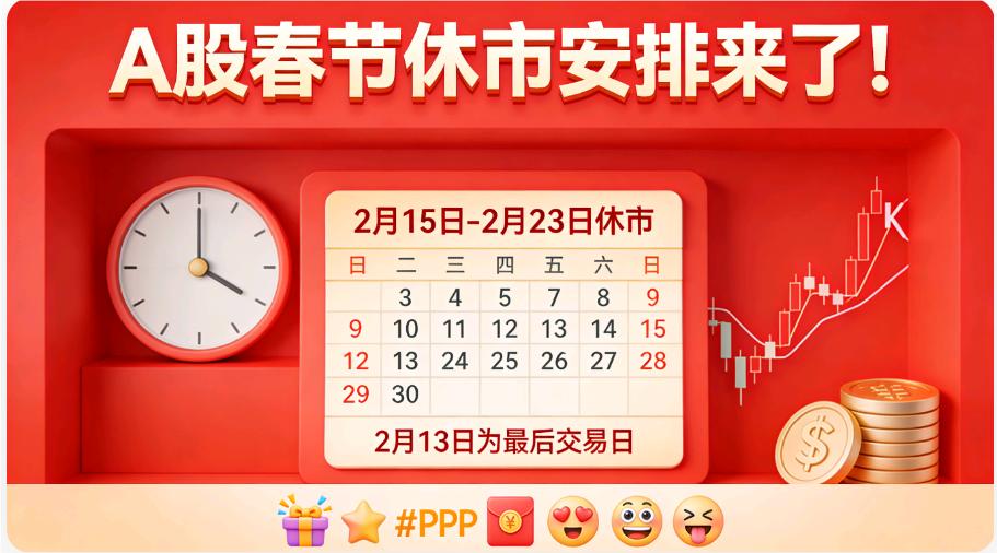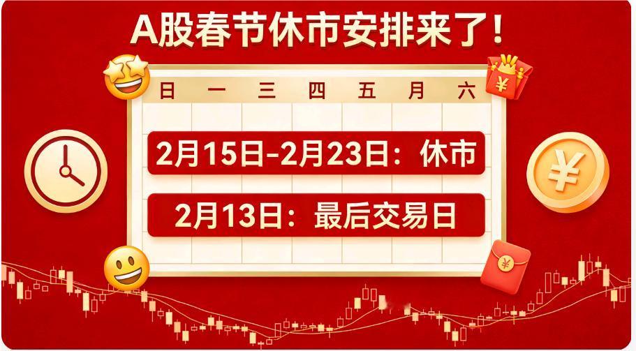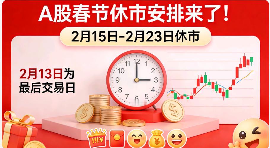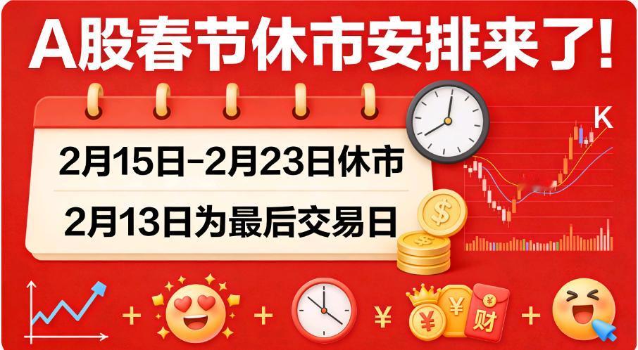 A股春节休市安排来了!📈 股民朋友们注意啦!2026年A股春节休市时间已官宣,赶紧收藏这份攻略,安心过年不踩坑!🎉 沪深北交易所同步公告:2月15日(周日)至2月23日(周一)休市,共9天,2月24日(周二)起照常开市。另外,2月14日(周六)、2月28日(周六)为周末休市,不交易哦⏳。 节前最后交易日是2月13日(周五),需要提现过年的朋友,务必在当天15:00前完成资金转出,休市期间无法操作💰。想赚点“躺平收益”的,可在13号操作1天期国债逆回购,能享9天利息,深市1000元起投,新手也能轻松上手✨。 港股通同步休市,2月15日-23日暂停服务,24日恢复。休市期间记得合理安排资金,远离场外配资,祝大家马年投资顺利,节后开门红🐎! A股过年行情 年底A股 股市时间表 股市休市时间 节前股市 A股休市时间表 A股开放