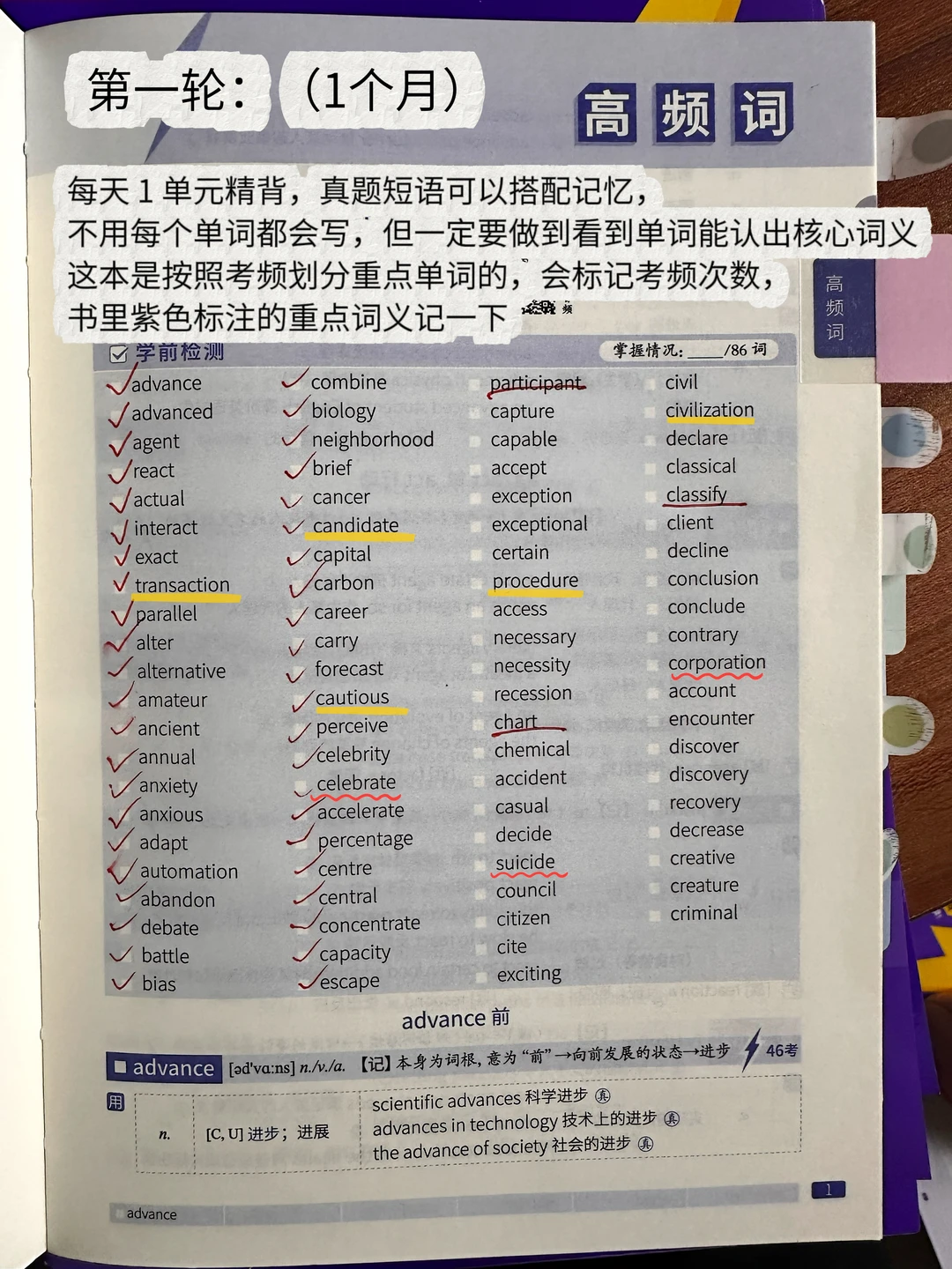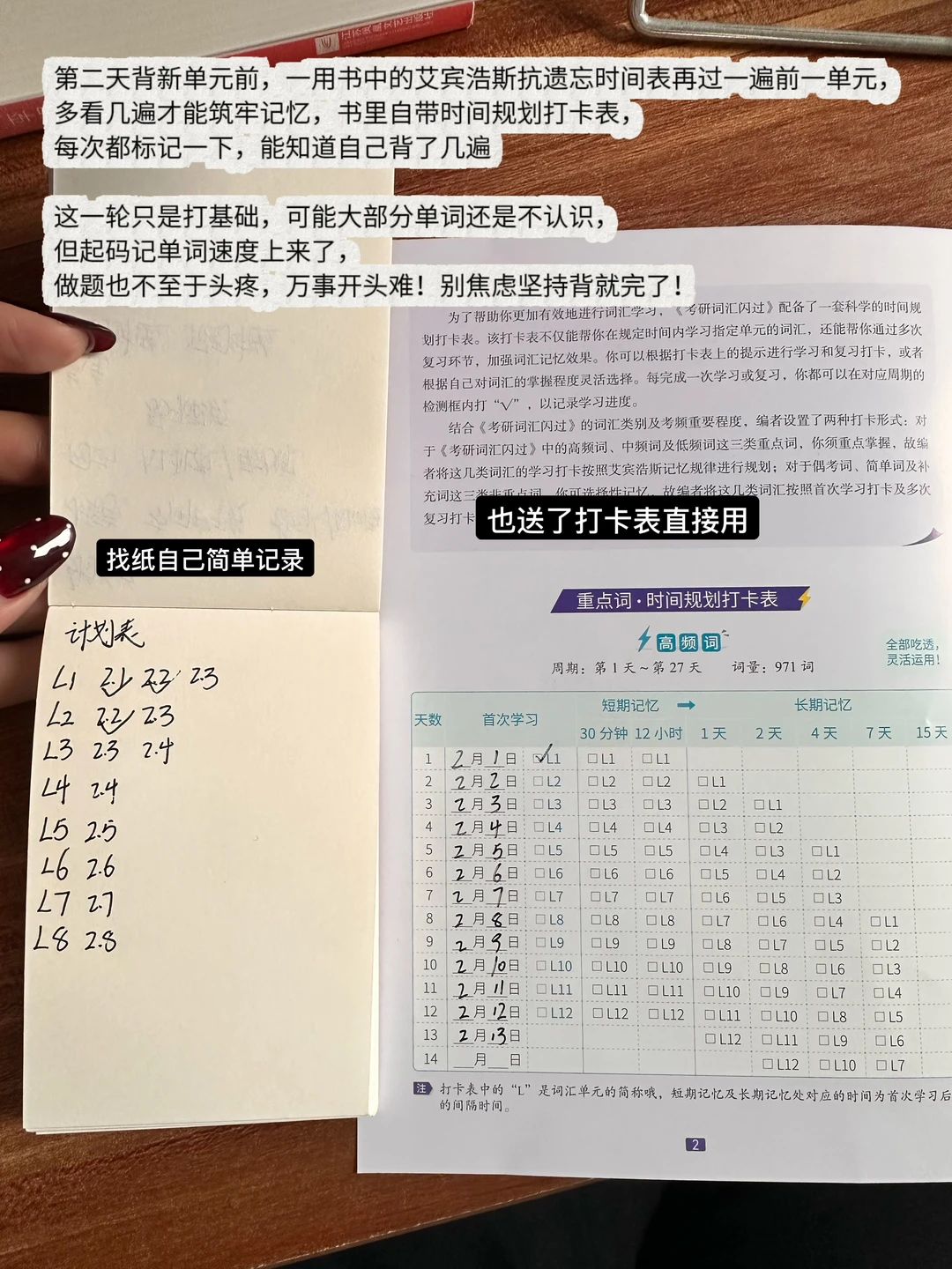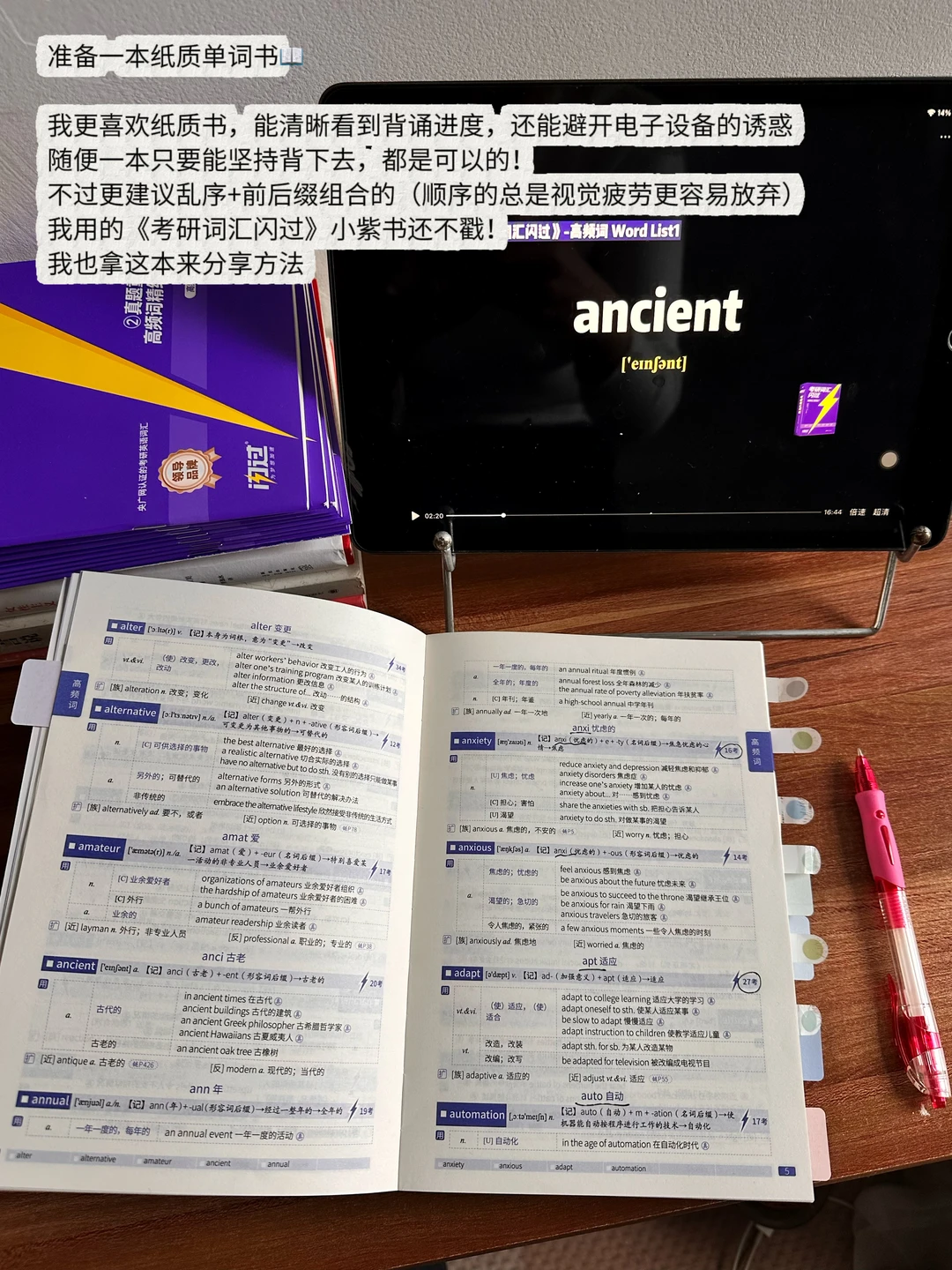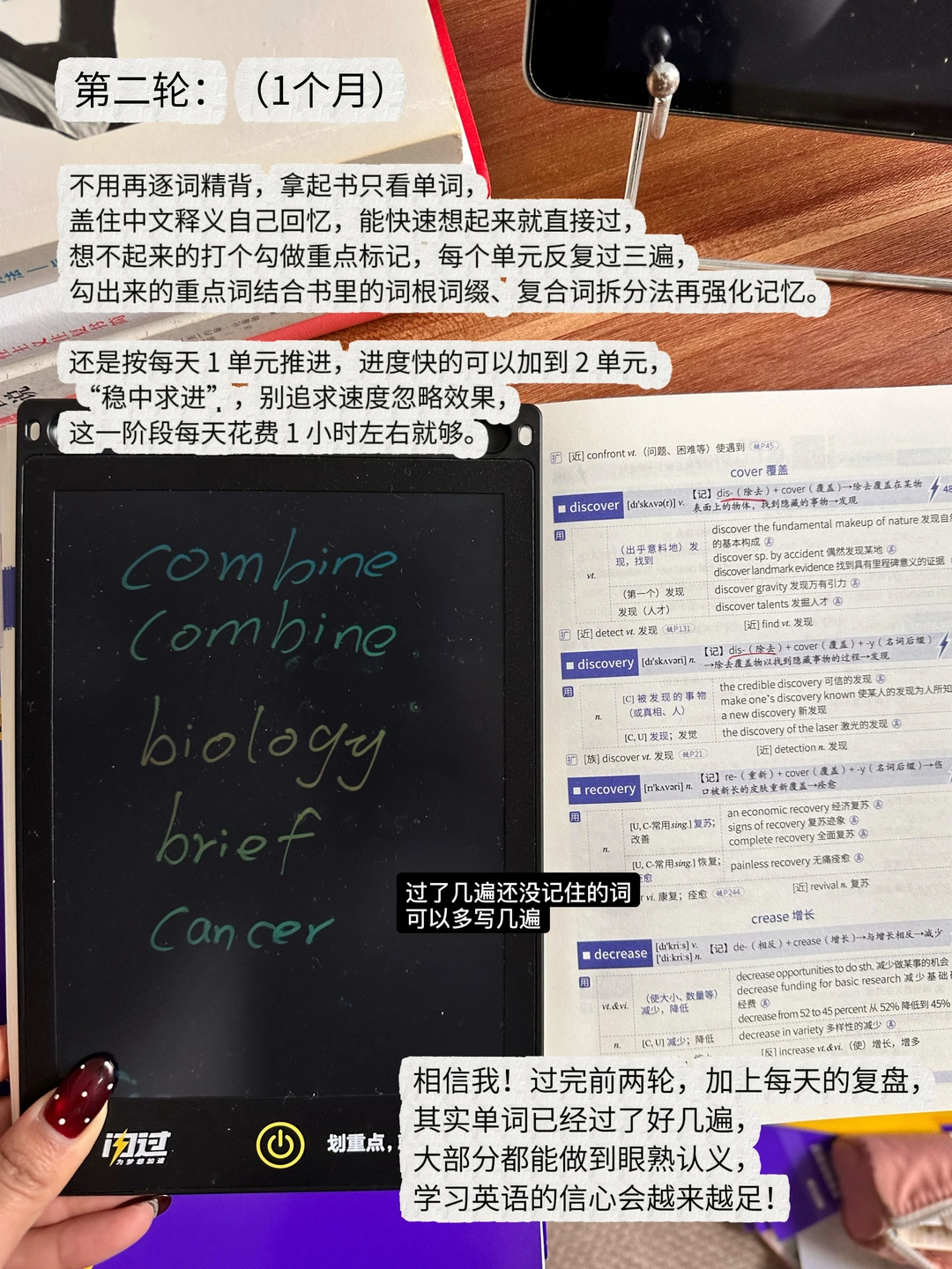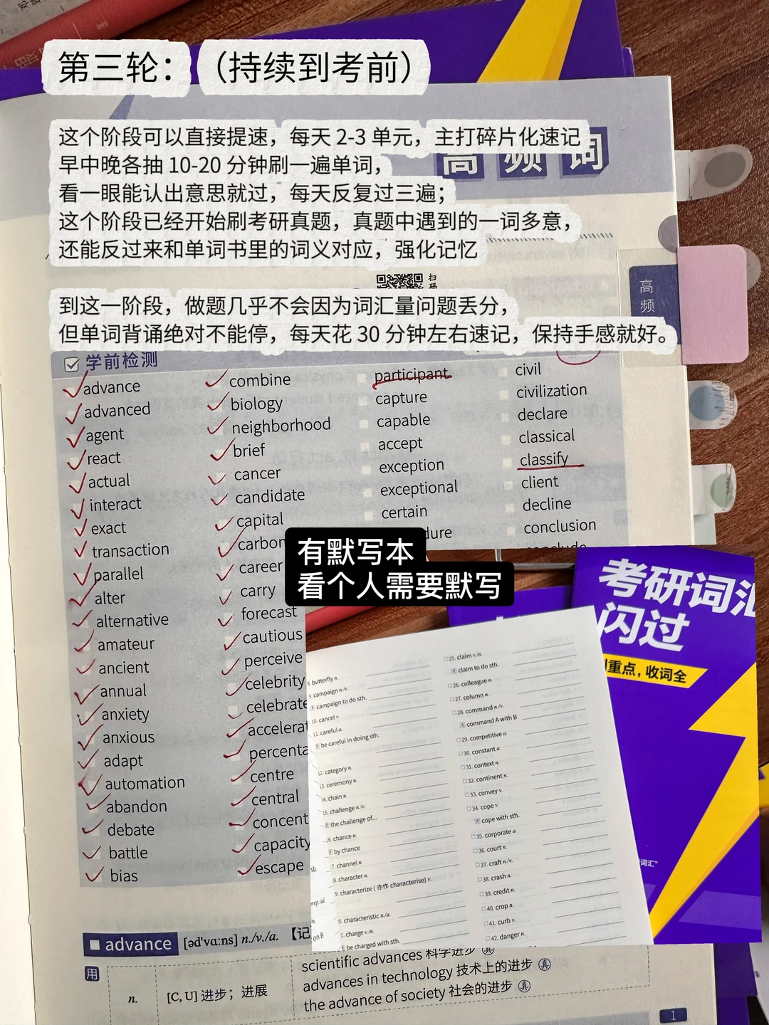 我是专科生直接考研,英语基础也很差 当时考研四级都没过,背单词也是下了不少功夫的 后来发现,考研英语背单词根本不用死磕拼写! 用 “眼” 认义就够了,这个方法亲测提了20分! 背单词头疼的照搬就行 💡准备一本纸质单词书 (我更喜欢纸质书,能清晰看到背诵进度,还能避开电子设备的诱惑) 随便一本只要能坚持背下去,都是可以的! 不过更建议乱序+前后缀组合的(顺序的总是视觉疲劳更容易放弃) 我用的《考研词汇闪过》还不戳! 我也拿这本来分享方法 ⭐️第一轮:(1个月) 每天 1 单元精背,真题短语可以搭配记忆,不用每个单词都会写,但一定要做到看到单词能认出核心词义 这本是按照考频划分重点单词的,会标记考频次数,书里紫色标注的重点词义记一下 书里配套的词汇精讲课,碎片时间可以听一听,老师会把高频词、真题短语再梳理,比自己死记效率高很多。 这一阶段偏磨基础,每天背单词大概 2 小时,不要因为花时间太多心慌,都是正常的!第二天背新单元前,一用书中的艾宾浩斯抗遗忘时间表再过一遍前一单元,多看几遍才能筑牢记忆,书里自带时间规划打卡表,每次都标记一下,能知道自己背了几遍 ⭐️第二轮:(1个月) 不用再逐词精背,拿起书只看单词,盖住中文释义自己回忆,能快速想起来就直接过,想不起来的打个勾做重点标记,每个单元反复过三遍,勾出来的重点词结合书里的词根词缀、复合词拆分法再强化记忆。 还是按每天 1 单元推进,进度快的可以加到 2 单元, “稳中求进”,别追求速度忽略效果,这一阶段每天花费 1 小时左右就够。 ⭐️第三轮:(持续到考前) 这个阶段可以直接提速,每天 2-3 单元,主打碎片化速记 早中晚各抽 10-20 分钟刷一遍单词,看一眼能认出意思就过,每天反复过三遍;这个阶段已经开始刷考研真题,真题中遇到的一词多意,还能反过来和单词书里的词义对应,强化记忆 到这一阶段,做题几乎不会因为词汇量问题丢分,但单词背诵绝对不能停,每天花 30 分钟左右速记,保持手感就好。 背不过单词可以来试试! 考研词汇闪过 闪过 考研英语 英语单词速记 英语学习方法 英语词汇 考研备考攻略 单词书推荐