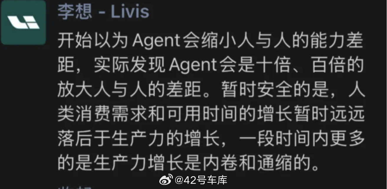 今年以来,李想强调最多的就是 AI。他在全员会上说:「2026 年是 AI 头部公司最后上车点」;在朋友圈写到:Agent 将十倍、百倍地拉大人与人之间的差距。都能看出李想向 AI 公司转型的决心。而消费需求落后于生产力增长带来的「内卷」,意味着只有率先掌握 Agent 并将其转化为生产力的公司,才能在存量市场中生存。