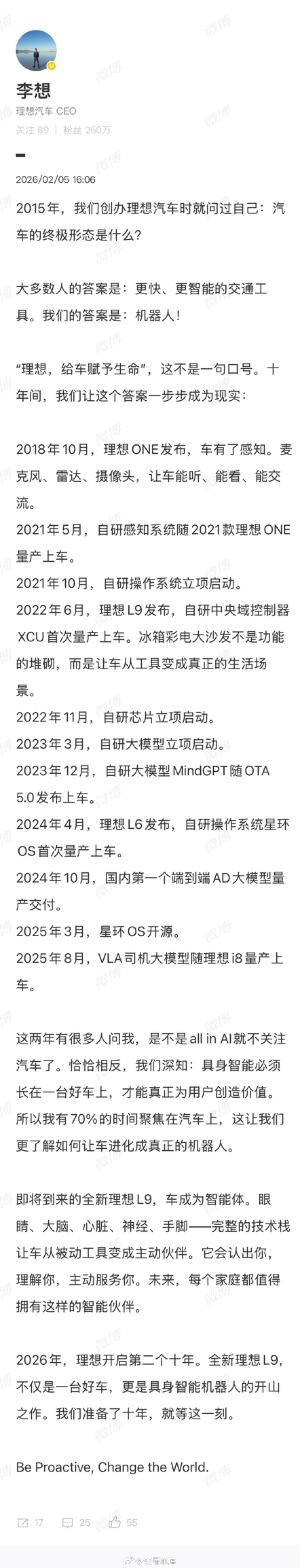 如果回看过去十年,理想一直朝着这个方向努力:从 2018 年理想 ONE 的感知起步,到控制器 XCU、自研芯片(M100)、自研大模型(MindGPT)、自研系统(星环 OS),再到 2025 年的 VLA 司机大模型,理想的 AI 技术栈在不断完善。而即将到来的全新理想 L9,将集成「眼睛、大脑、心脏、神经、手脚」的技术链条,李想称其为「具身智能机器人」。