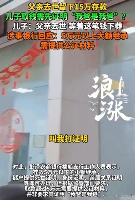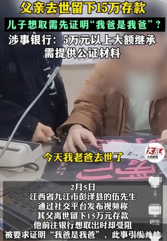 江西九江,伍先生的父亲在生前省吃俭用存了150000元,分5个存单,其中一个20000元的存单到期了,伍先生想取出来给父亲办葬礼,他拿着户口本、火化证、父子二人的身份证去银行取钱,却被要求出示继承权公证书,银行称取款超50000元就得这样! 躺在殡仪馆的,是伍先生的老父亲。 2026年2月2日走的,骨灰盒还在那搁着,等着钱下葬。 老人家一辈子抠搜,省下15万,分了五张存单,这钱是他留给自己的“棺材本”。 急等用钱的伍先生,翻出一张到期的2万存单,想着先取这钱把丧事办了,户口本、火化证、父子俩身份证,全带齐了,跑到银行柜台,以为十分钟能搞定的事,卡住了。 柜台里的人,头都不抬,扔出一句话:取不了。 伍先生懵了,问为啥? 柜员:要证明你爸是你爸,还得公证。 伍先生火了,证都在这,还不够? 银行的理由挺硬:存款超5万就是大额遗产,必须所有继承人公证。 伍先生这15万没超吗?虽然只取2万,但那是遗产的一部分,规定就是规定,雷打不动。 柜员冷冰冰回:我们也没办法,怕以后有人找麻烦。 其实银行也有苦衷,以前这种事闹过太多纠纷,兄弟姐妹争遗产,银行成了被告,现在学精了,没公证书,天王老子来也不给钱,这是自保,不是针对谁。 可这自保,用错了地方,人死在殡仪馆,急等钱下葬,这是特殊情况,银行有“特事特办”的条款,但没人敢用,谁用了,出了事谁担责?柜员也是打工的,不想丢饭碗。 伍先生这2万块,卡在“5万”的门槛上,如果只存了4万,是不是就能取了?或者老人没存这15万,是不是就不用公证了?这规定,是不是太死板? 法律上讲,银行没做错,继承法摆着呢,超过一定数额确实要公证,但法律也讲公序良俗,让家属拿着死亡证明、户口本还要去公证,这不折腾人吗? 公证处也不是24小时开门,办个公证得跑断腿,还得花钱,伍先生现在哪有心思跑这个?骨灰盒还在冰柜里躺着呢。 伍先生作为合法继承人,在父亲去世后有权继承其存款。 依据民法典第一千一百二十七条,伍先生作为子女属于第一顺序继承人,有权继承父亲遗产。 银行要求伍先生出示继承权公证书,虽看似不近人情,但实则有法律依据。依据商业银行法第二十九条,银行有保护存款人隐私和资金安全的义务。 在存款人去世且涉及大额资金时,银行要求继承权公证书,是为了防止其他继承人提出异议,引发纠纷,这符合商业银行操作规范。 不过,银行在执行规定时,也应考虑特殊情况。 老人存钱是为了防老,结果死后这钱成了取不出来的死钱,银行守住了钱,却丢掉了人心,以后谁还敢把钱存进去?不怕死后家属取不出来? 这15万存单,成了伍先生的紧箍咒,取一点要公正,取全部也要公证,不取老人没法安息,这死结,系得太紧了。 这2万块钱的取款单,签得比千斤还重,签的不是名,是无奈,是愤怒,是对现实的妥协。 无论如何,还得伍先生自己去面对,希望他能早点把钱取出来,别让老人在殡仪馆等太久,那是最后的体面,别被这几张纸给毁了。 您觉得银行在坚持规定和提供人性化服务之间,该如何找到平衡点呢?