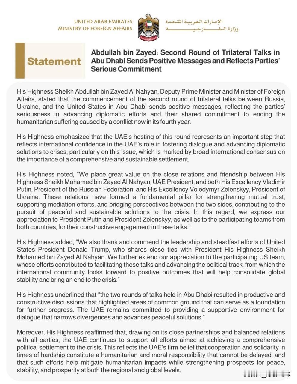 阿联酋外长积极评价俄乌美三方第二轮谈判 阿联酋外长谢赫·阿卜杜拉·本·扎耶德·阿勒纳哈扬称,俄乌美在阿布扎比举行的三方谈判第二轮是积极信号,印证各方愿推进外交努力、共同结束持续四年战争带来的人道主义苦难。 此次谈判在阿联酋举办,是国际社会认可阿方作为危机外交对话平台的重要体现;阿联酋凭借与俄总统普京、乌总统泽连斯基的紧密关系,成为凝聚互信、推动各方立场靠拢的重要支撑。 阿勒纳哈扬特别感谢普京、泽连斯基及两国代表团的建设性参与,感谢美国总统特朗普的领导与持续努力、美国代表团对谈判推进的促成作用,国际社会期待谈判带来积极成果,筑牢全球稳定、终结危机。 阿勒纳哈扬强调,两轮阿布扎比谈判均内容充实、富有建设性,各方已明确后续推进的契合点;阿联酋将持续为对话创造条件,推动缩小分歧、促成和平解决方案。