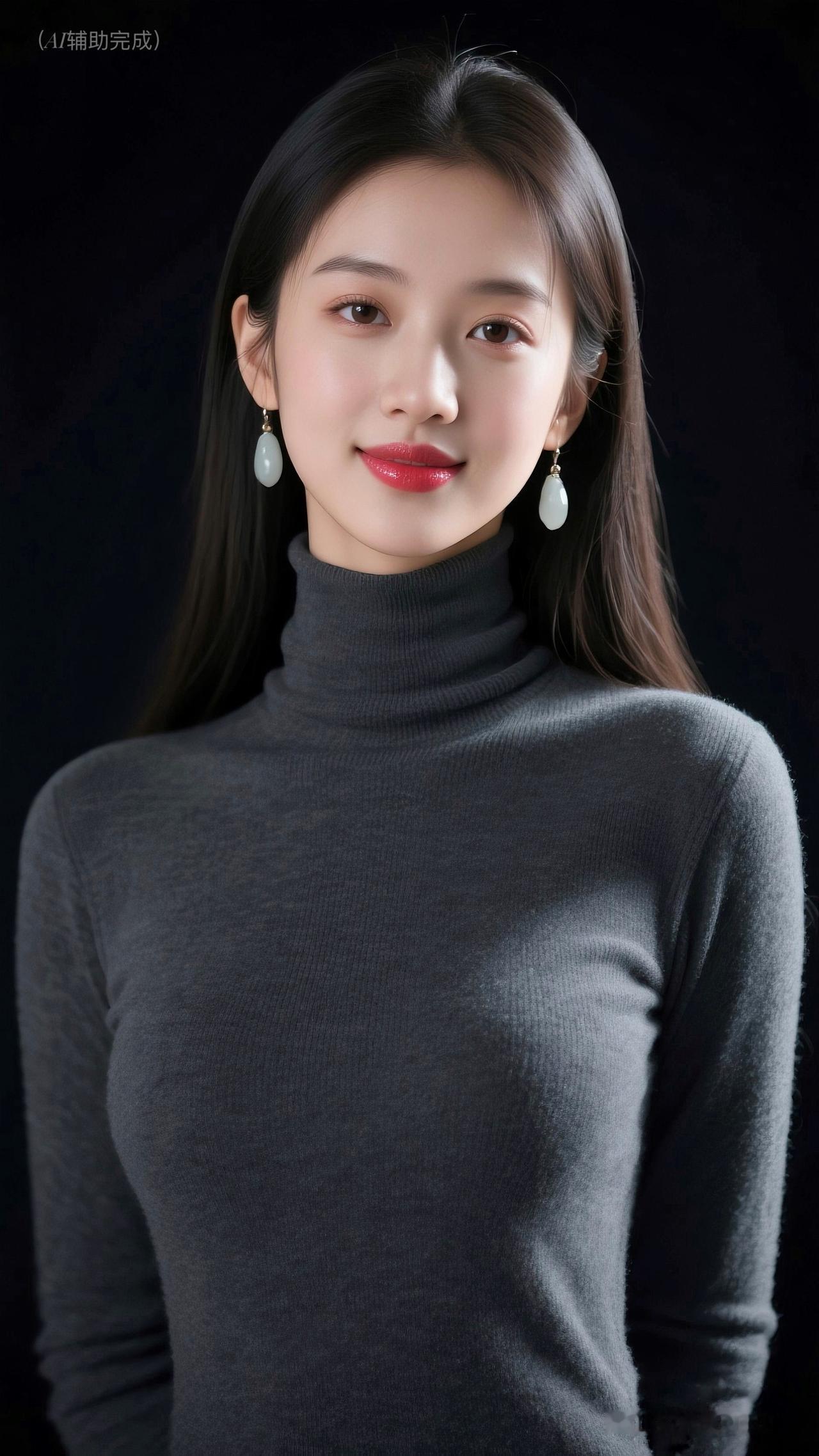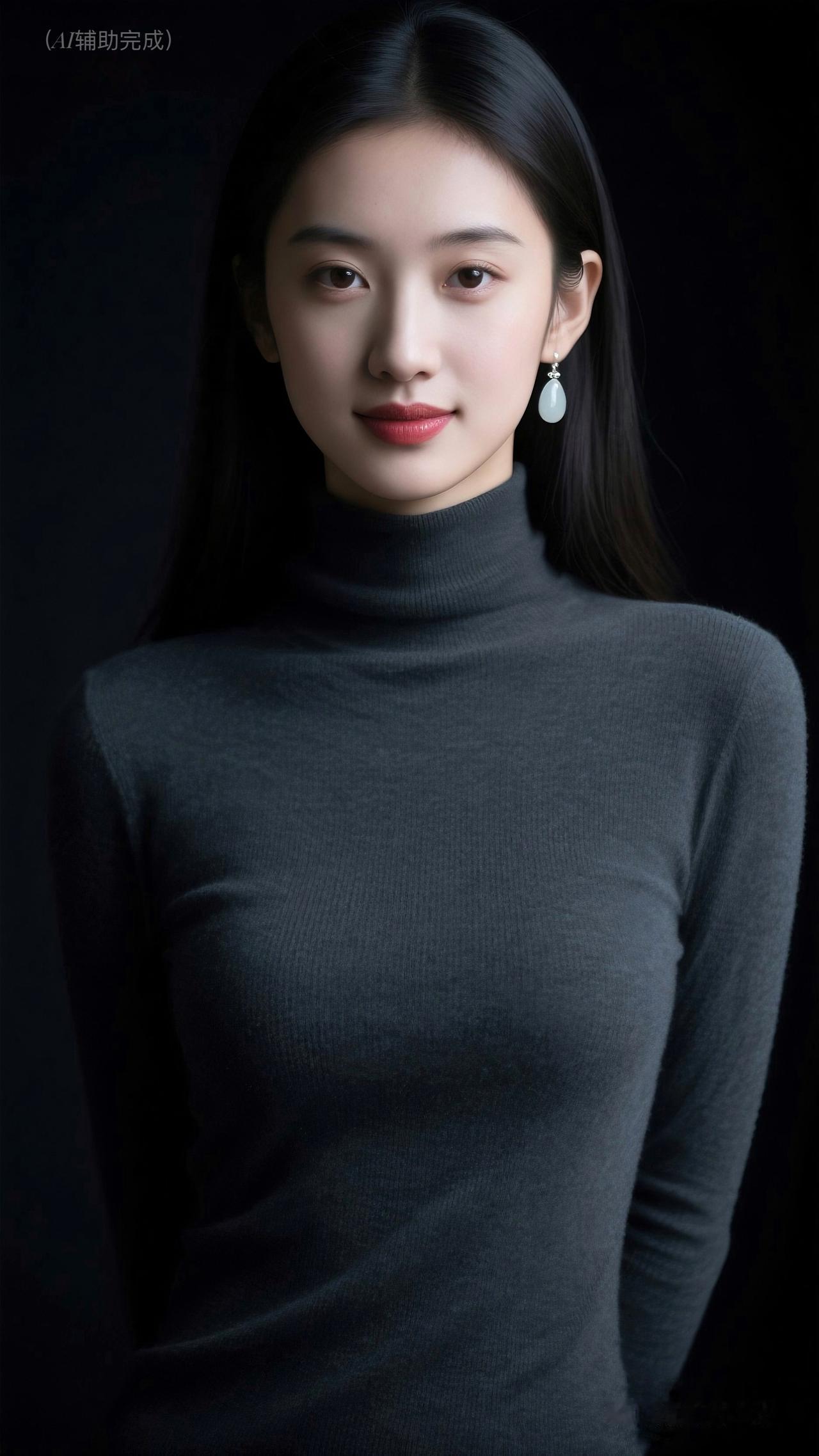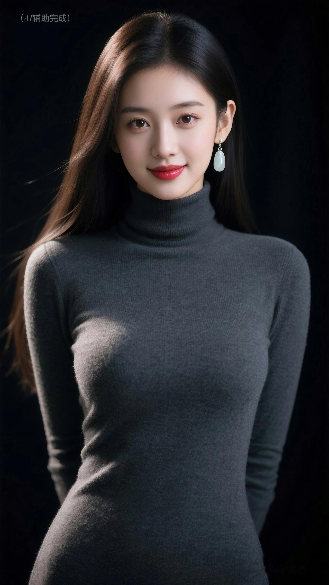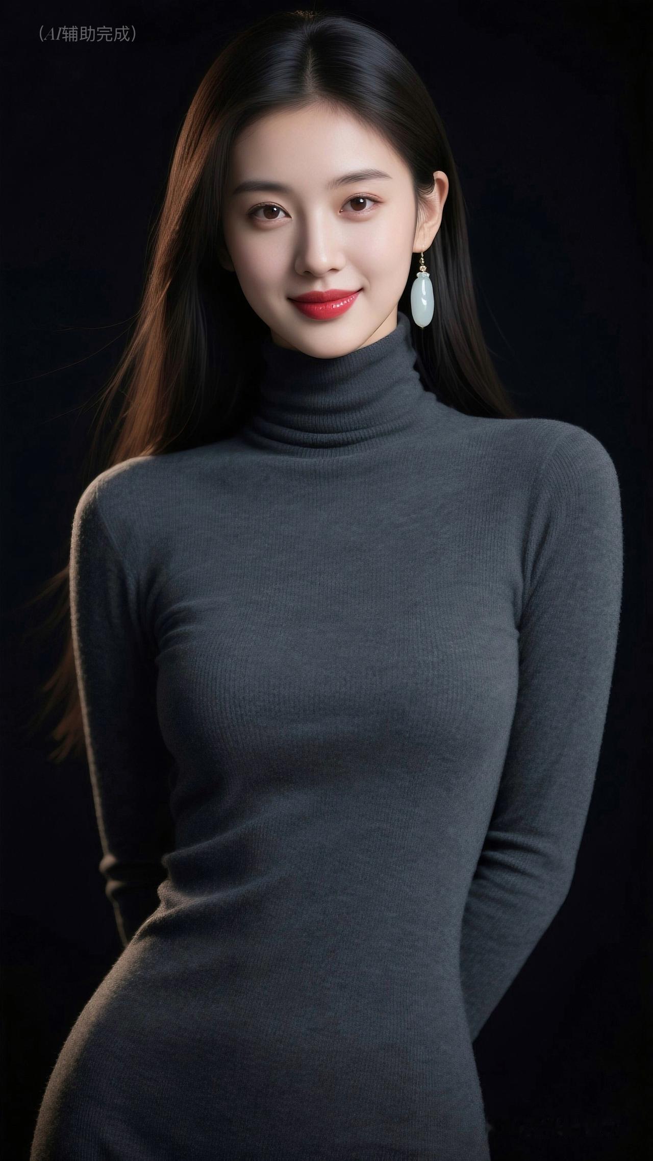 乌发垂肩泛柔光,深灰高领毛衣裹曼妙。水滴玉饰添雅,眉眼含笑眸亮如星,红唇娇艳点绛。纯黑背景衬静谧,温婉知性优雅漫帧间,如静谧肖像画,一眼沦陷!