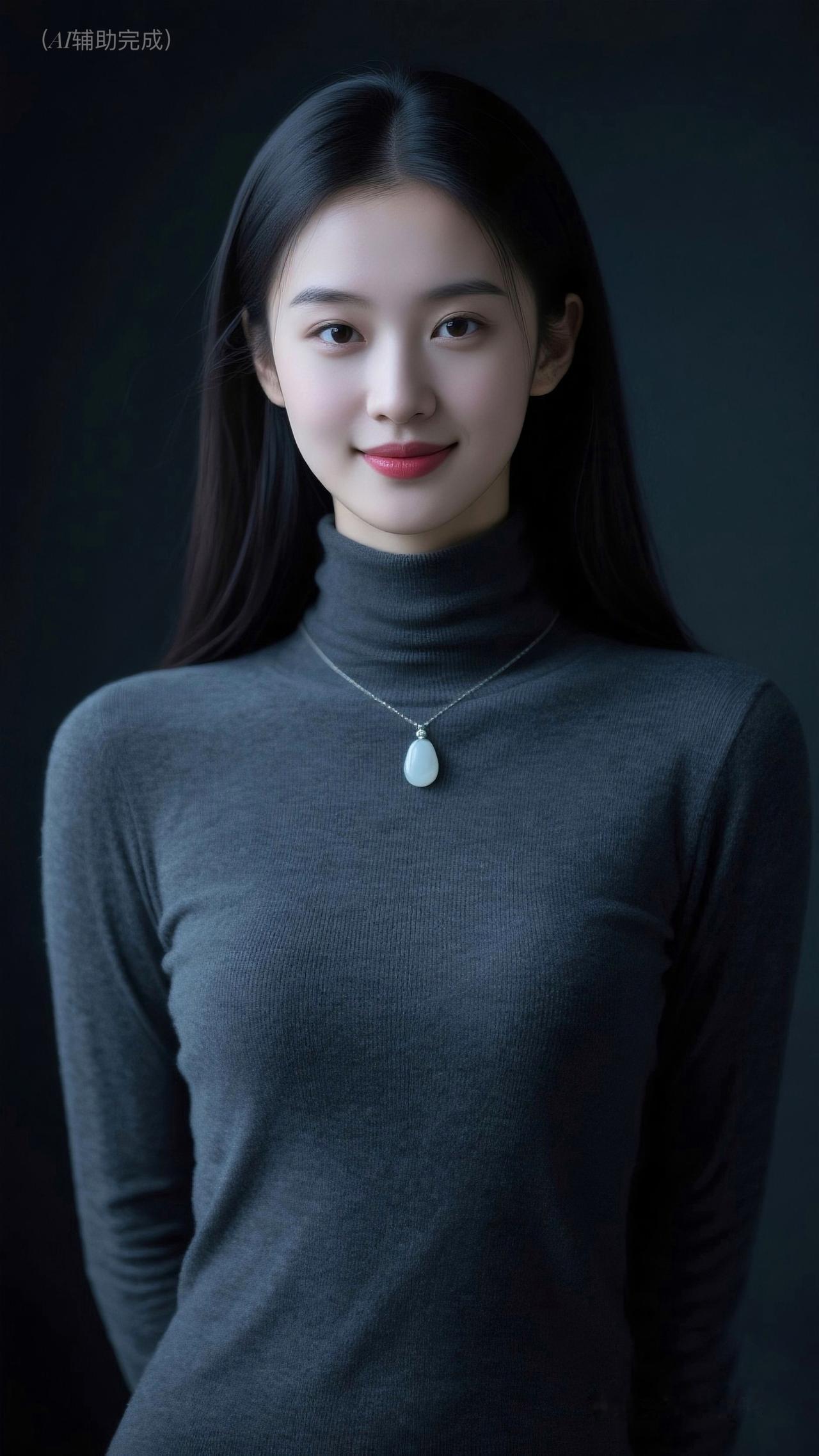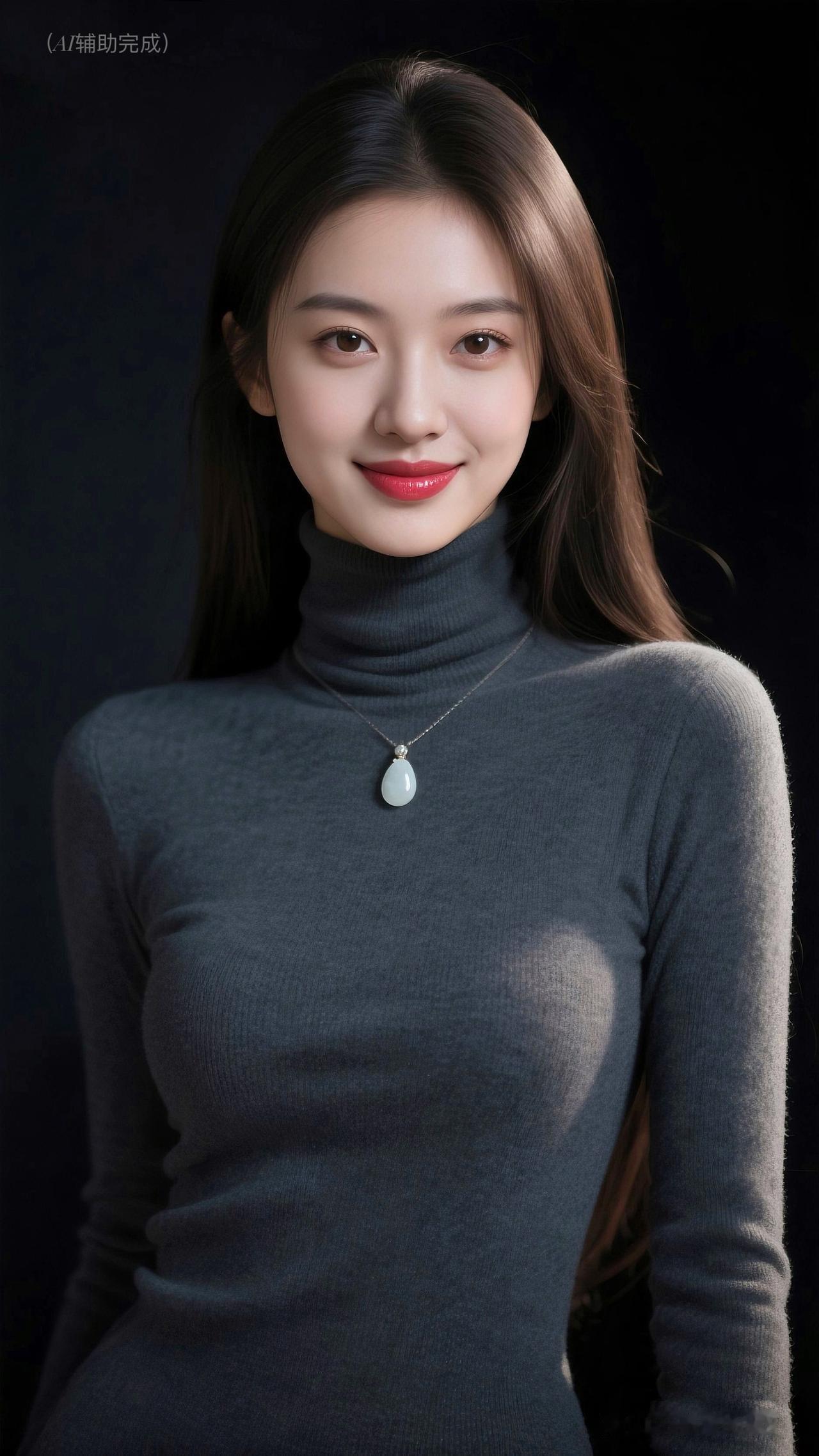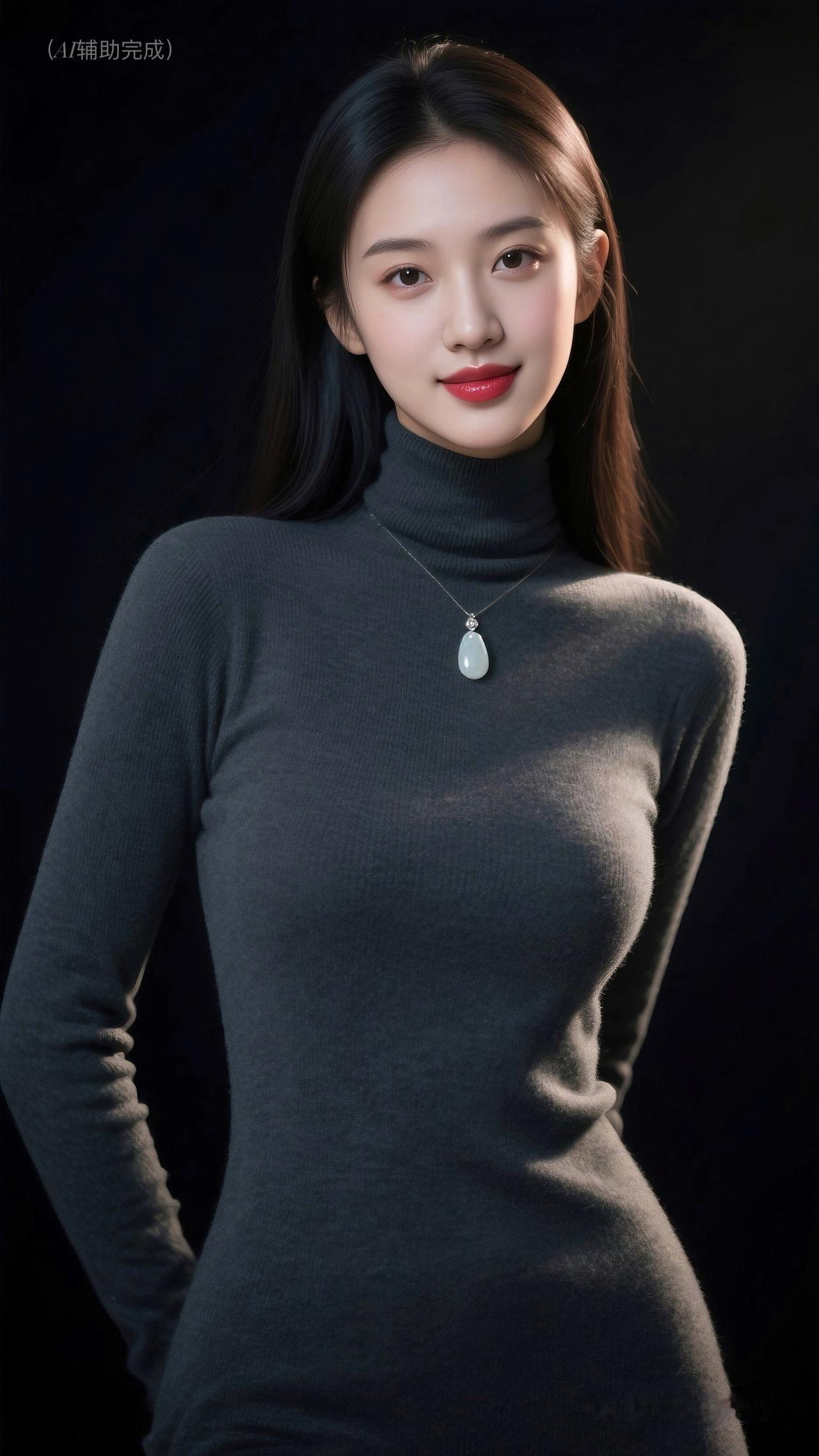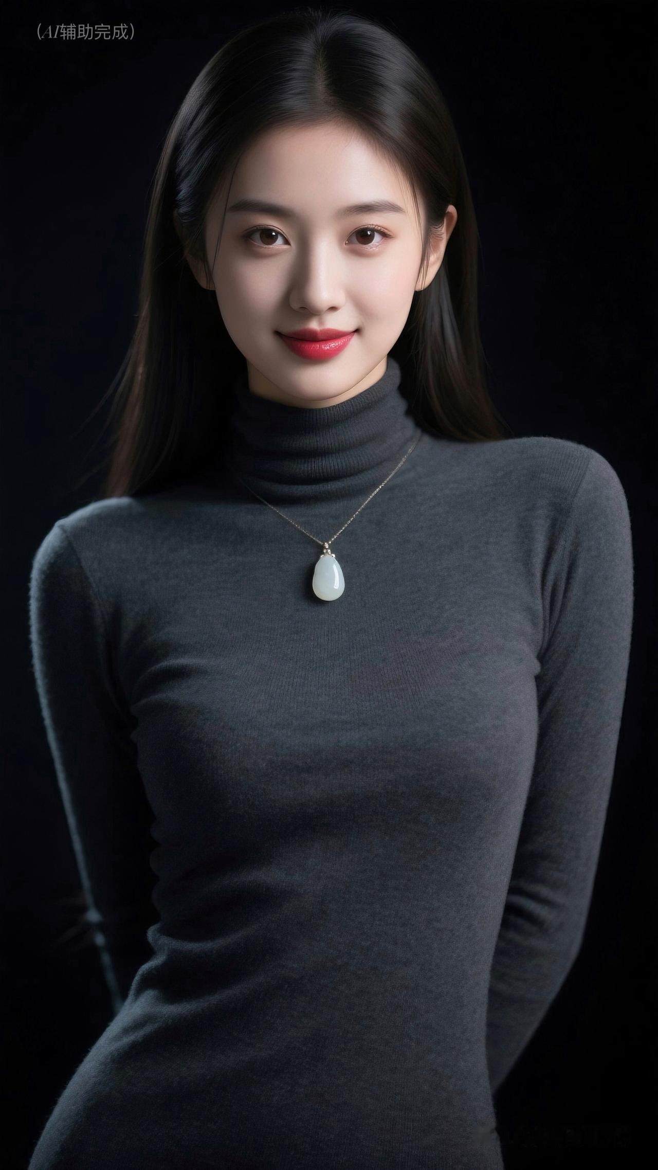 乌发垂肩泛柔光,深灰高领毛衣裹曼妙。水滴玉饰添雅,眉眼含笑眸亮如星,红唇娇艳点绛。纯黑背景衬静谧,温婉知性优雅漫帧间,如静谧肖像画,一眼沦陷!