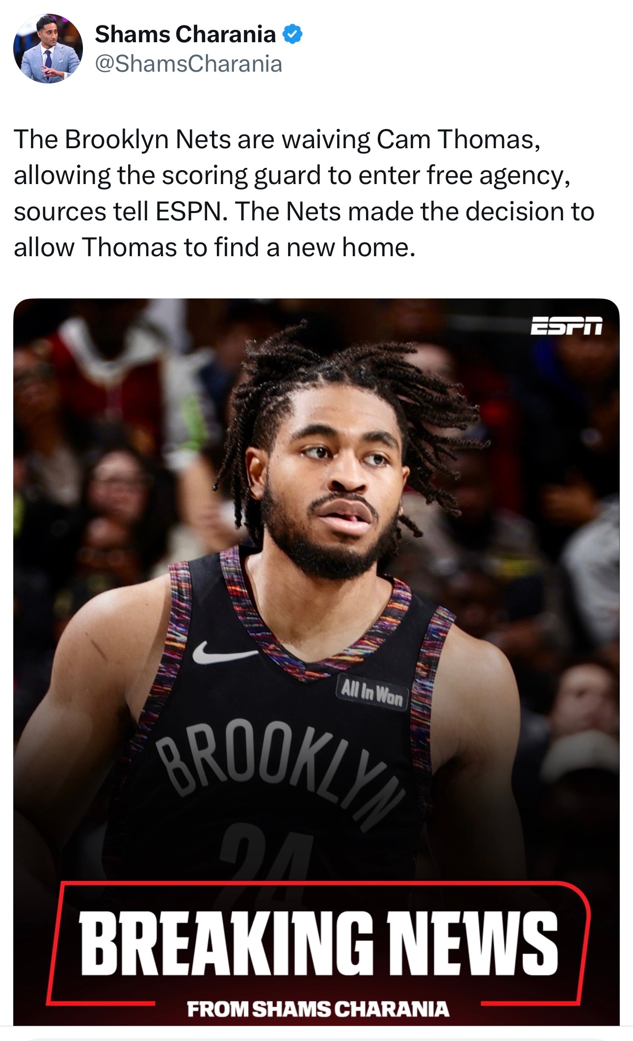 Shams:篮网裁掉了后卫卡姆·托马斯,让他有机会在其他球队重新开始。