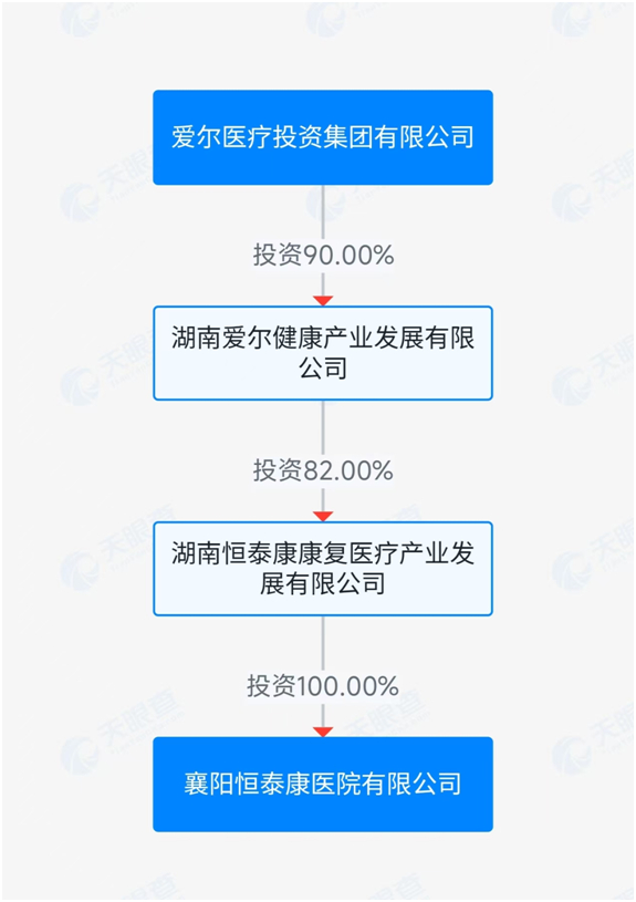 天眼查信息显示,襄阳恒泰康为爱尔医疗旗下成员之一,爱尔医疗对襄阳恒泰康存在间接控股。具体来看,襄阳恒泰康由湖南恒泰康康复医疗产业发展有限公司100%控股;而湖南爱尔健康产业发展有限公司又持有湖南恒泰康康复医疗产业发展有限公司81.9978%的股权;最终,爱尔医疗通过持有湖南爱尔健康产业发展有限公司90%的股权,实现了对襄阳恒泰康的间接控股。
