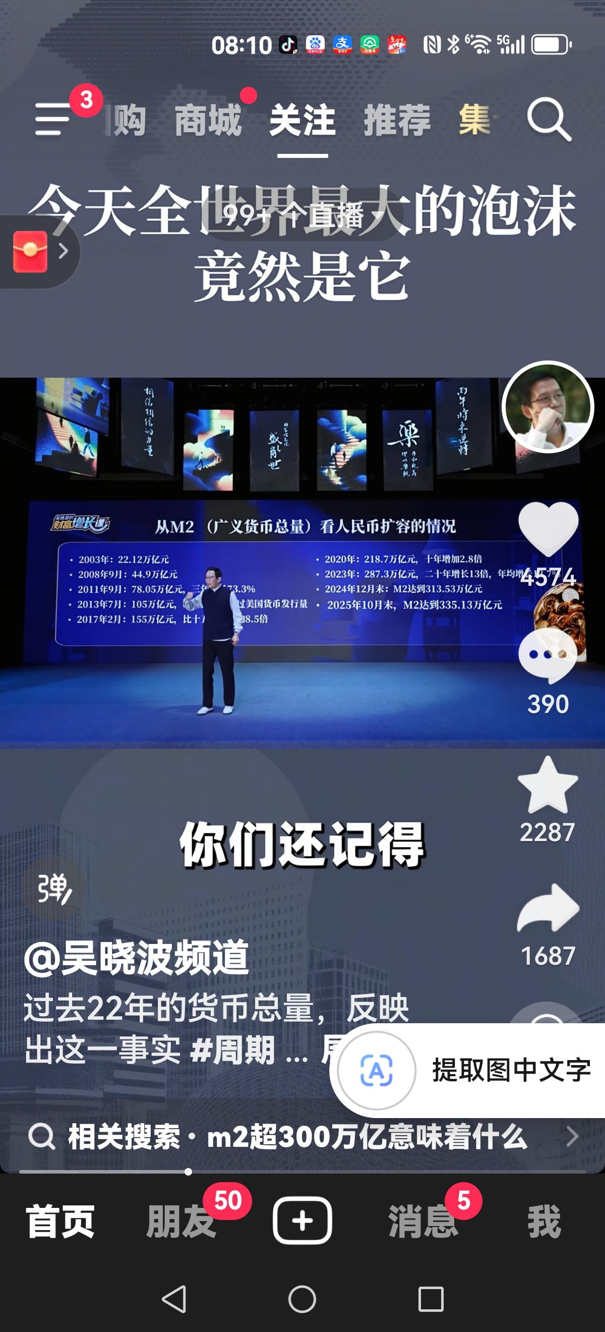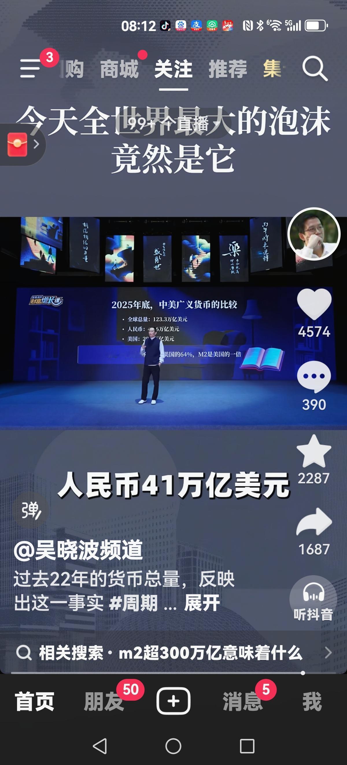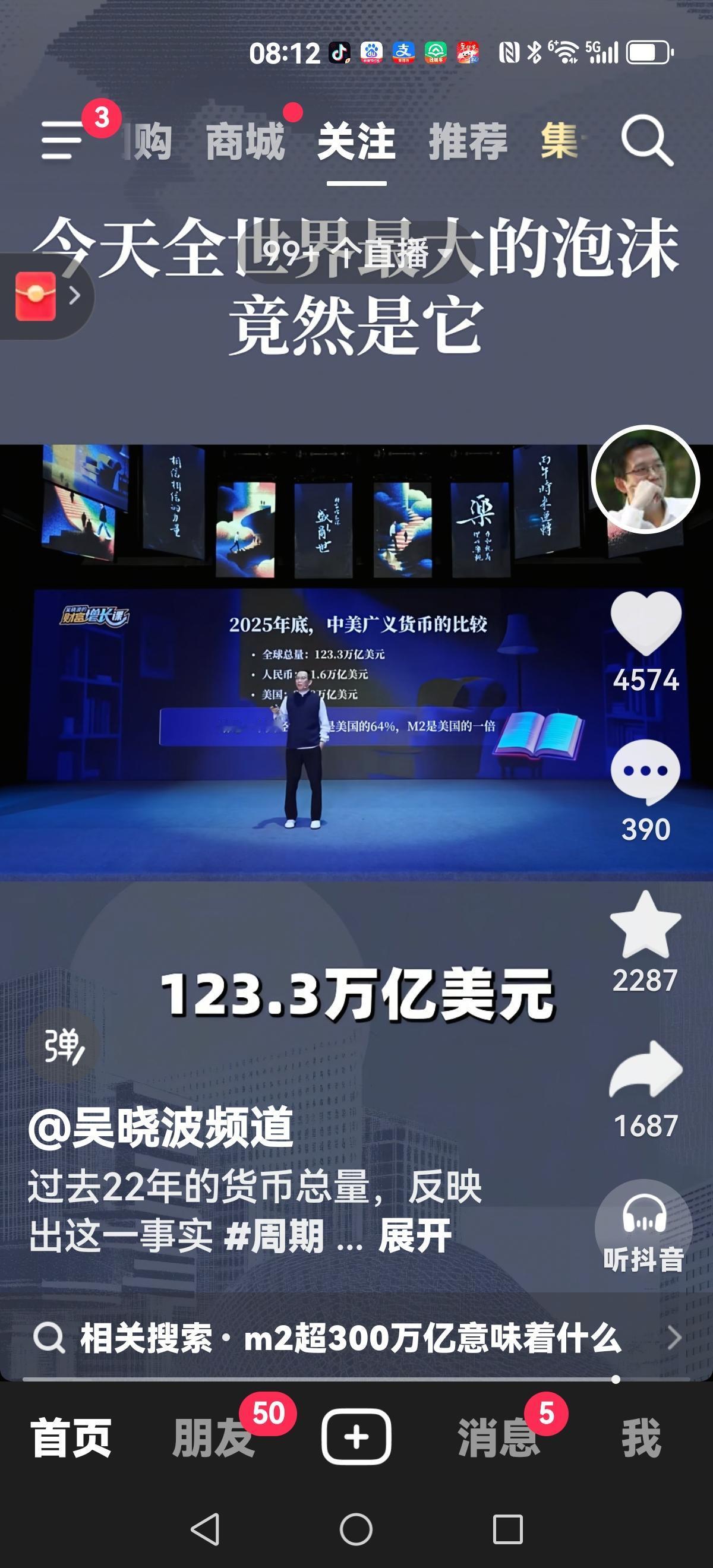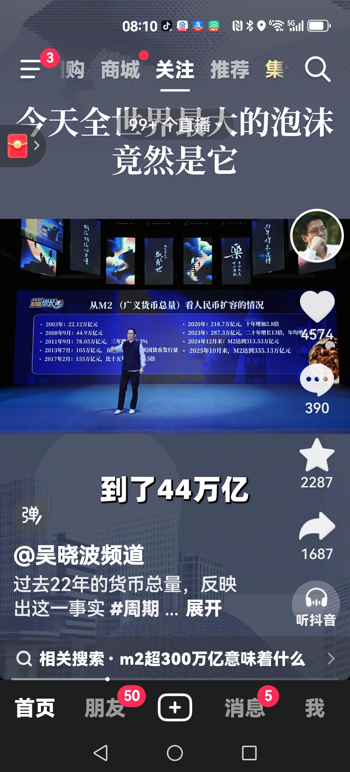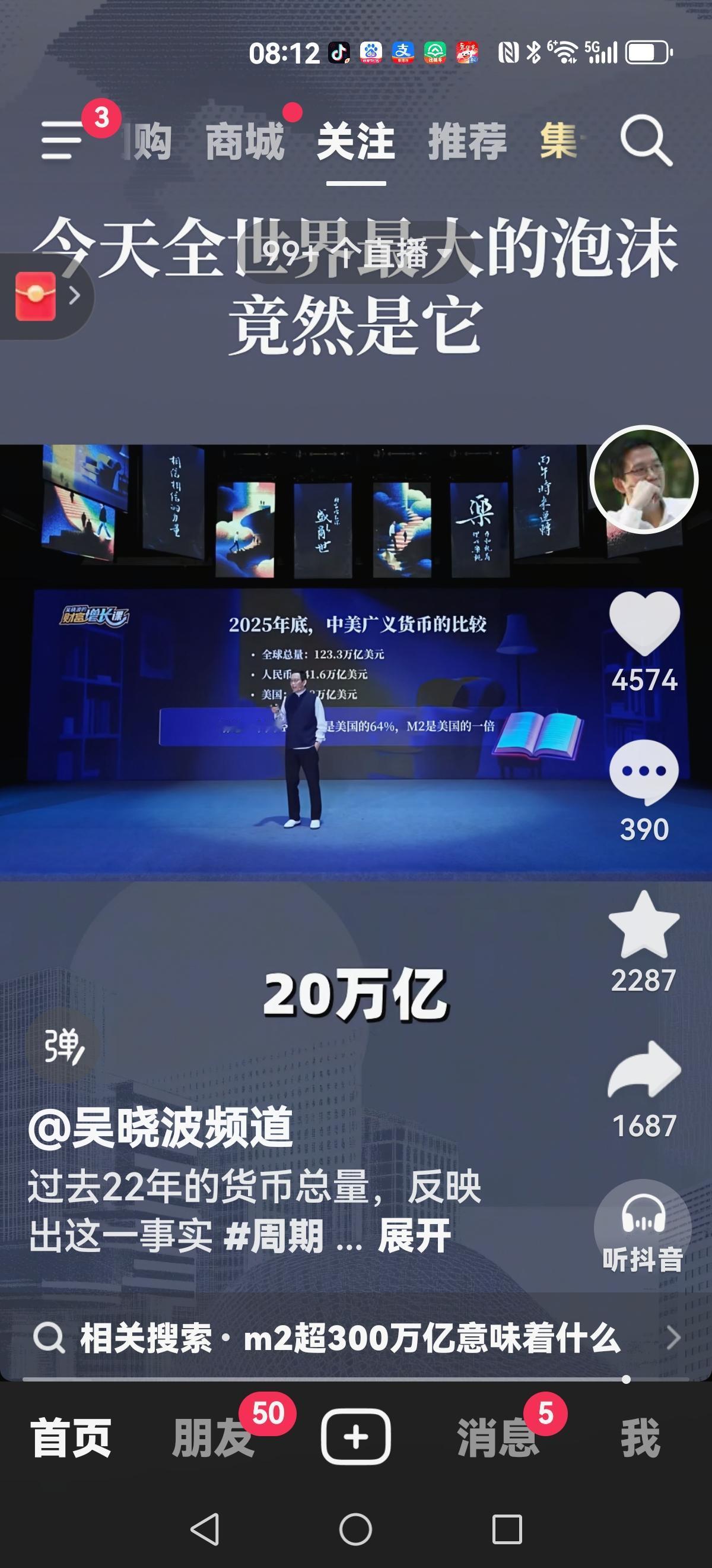 【吴晓波:最大的泡沫】 人民币M2(也就是广义货币总量)在2003年是22万亿人民币 2008年44万亿 2013年78万亿 2025年335.13万亿 到现在为止 世界M2总量123.3万亿美金 我们是41万亿美金 美国是20万亿美金 也就是现在你的口袋,我的口袋,加上银行储备的口袋所有钱是41万亿美金,287万亿(也有说300多万亿)。 你想想房子有人买,无人买,它也要配得上如此天价的M2啊