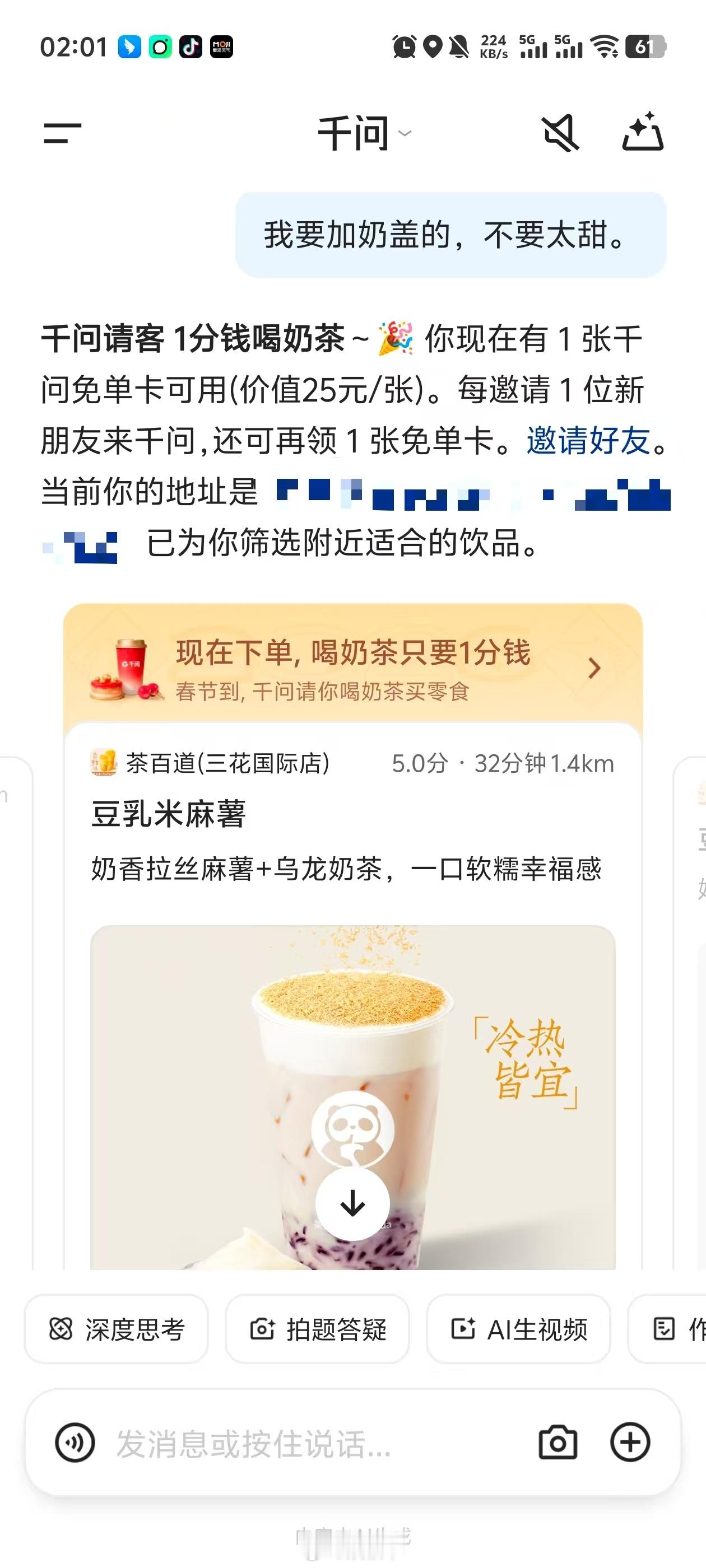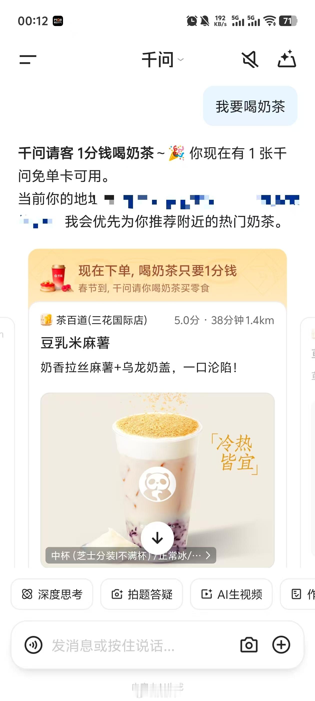 手把手教你薅千问免单奶茶家人们,千问这波福利太实在了!拉着室友试了下“春节30亿大免单”活动,说句"想喝喜茶锡兰牛乳茶,半糖少冰",AI秒推门店。用免单卡抵扣25元,实付1分钱,半小时奶茶就送到宿舍。关键是新老用户都能领免单卡,春节全家一起用AI点奶茶,这画面想想就温馨