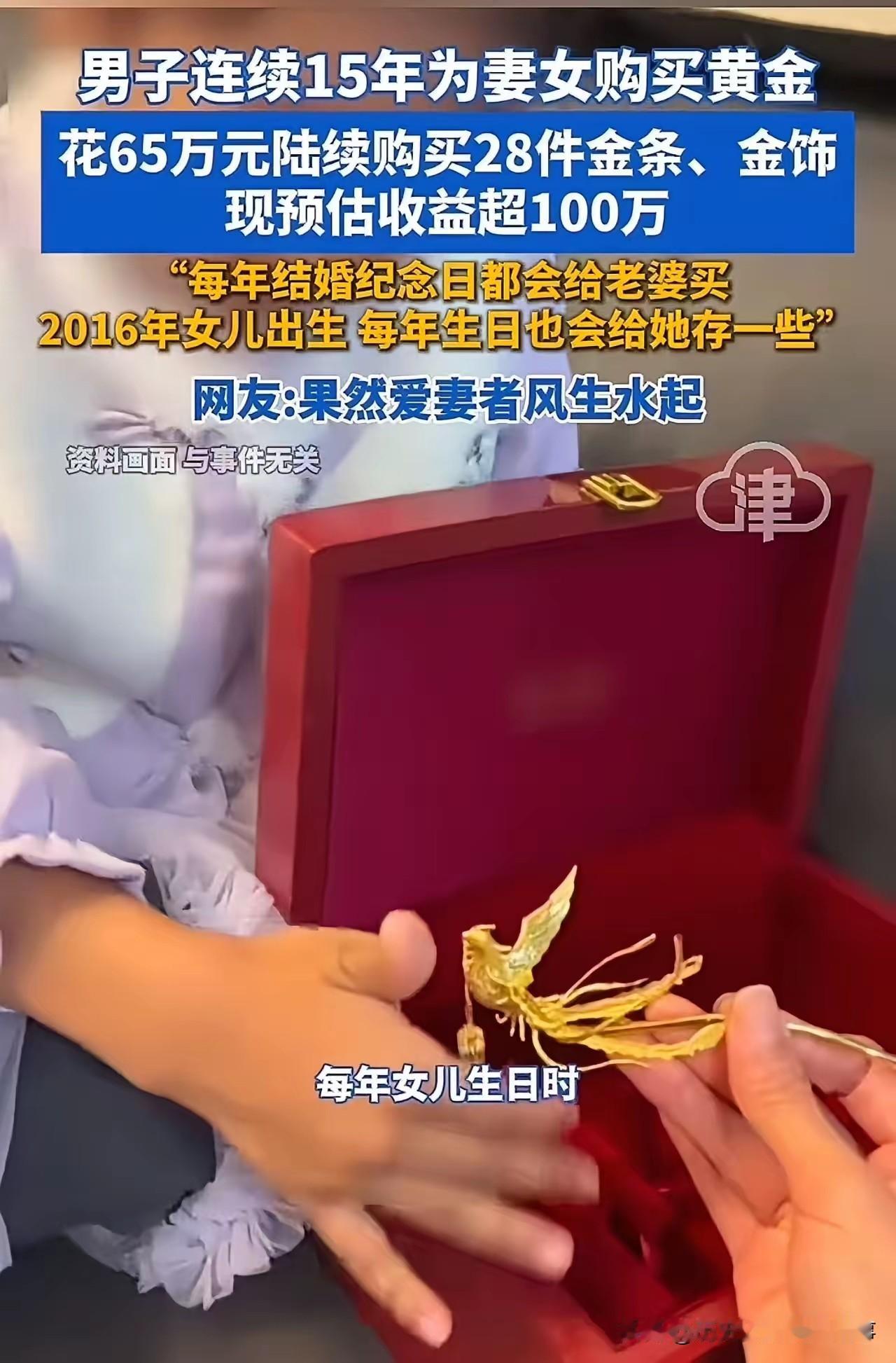 这哪是“买黄金”,分明是用15年的爱,做了一场穿越周期的“家庭定投”,最后爱情与财富双丰收,太好哭了! 一、核心数据(全网统一口径) - 人物:湖南长沙王先生(41岁) - 周期:2011年结婚起,连续15年 - 节点:结婚纪念日给妻子买金;2016年女儿出生后,女儿生日再加一份 - 数量:28件(金条+金饰) - 成本:累计投入约65万元,年均约4.3万 - 现价:按2026年初高位金价,估值超170万元 - 收益:净赚超100万元,收益率≈159% 二、为什么他“爱老婆就发财”? 1. 不是投机,是长期主义 他从不追涨杀跌,只在固定日子买,穿越牛熊、摊平成本,完美踩中黄金15年长牛,把“仪式感”做成了家庭强制储蓄+抗通胀资产。 2. 黄金的底层逻辑站得住 过去十几年,全球央行持续购金、地缘与通胀风险不断,黄金作为硬通货、避险资产,长期向上,普通人不用盯盘,拿得住就赢。 3. 家庭稳定=财富底座 把钱花在家人身上,换来情绪稳定、家庭凝聚力,这种“软资产”,比任何理财都更抗风险、更能生财。 三、普通人可抄的“黄金作业”(不踩坑版) - 买什么:优先银行投资金条(溢价低、易变现);金饰好看但工费高,更适合纪念,不适合纯投资。 - 怎么买:固定时间、小额分批(每月/每季度),别一把梭,别追短期暴涨。 - 卖不卖:家庭备用金、长期保值用,拿得住5–10年,别被短期涨跌吓出。 - 别碰:黄金期货、杠杆、不知名“黄金理财”,普通人只做实物+长期。 四、当下金价怎么看(2026-02-06) - 国际金价刚经历历史高位后的剧烈回调,短期波动大,但央行购金、降息预期、避险需求等长期支撑仍在。 - 国内黄金T+D约1058元/克,金店零售价约1550–1570元/克,银行投资金条约1120–1140元/克。 - 建议:不急着抄底,分批建仓、拉长周期,别把黄金当短线投机。 一句话总结:爱对了人,选对了资产,坚持住时间,财富自然会来敲门。 素材来源于网络