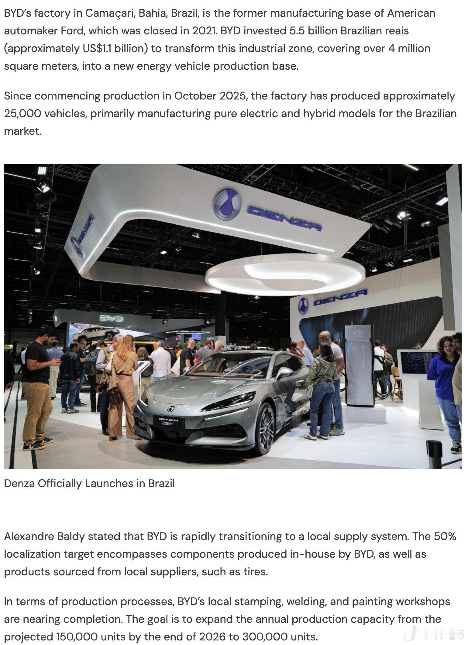 据比亚迪巴西高级副总裁亚历山大·巴尔迪披露,工厂计划2026年底实现15万辆/年的产能,未来将逐步扩充至30万辆/年,产能实现翻倍增长。本地化方面,比亚迪明确将2027年1月1日定为核心节点,届时将实现50%的零部件本地制造或采购,涵盖自有生产零部件及轮胎等本地供应商产品。
