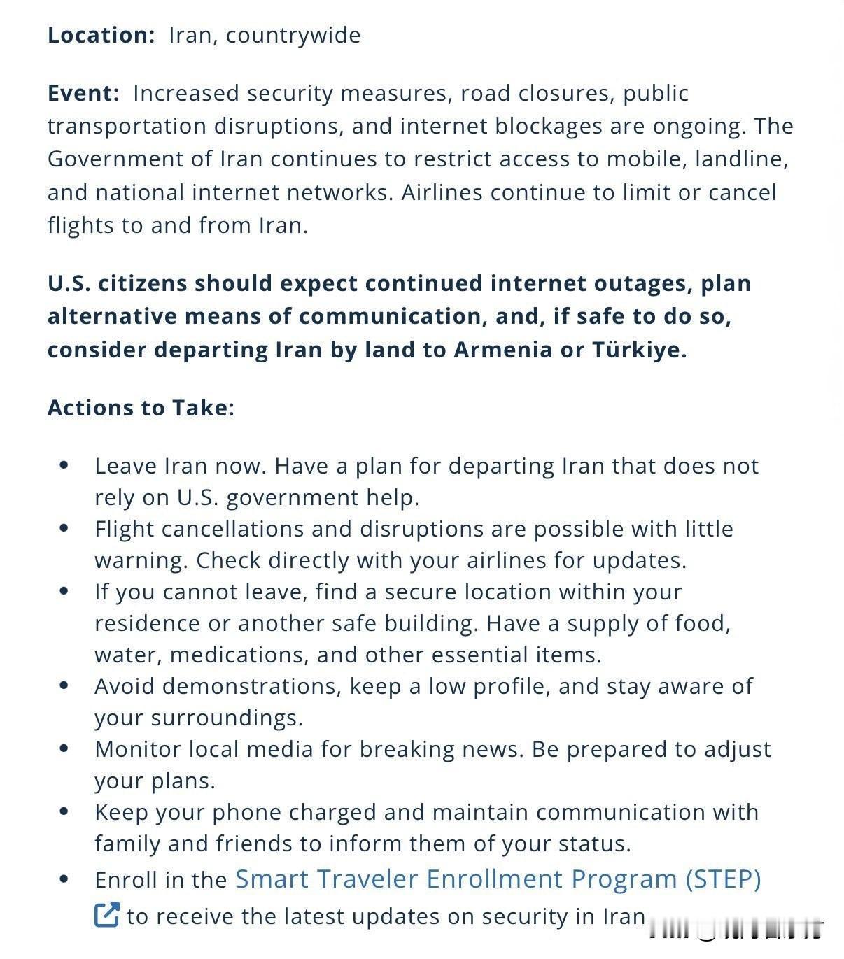 美国驻伊朗虚拟大使馆发布了最新旅行警示,重申此前呼吁美国公民立即离开伊朗,可通过商业航班或经由亚美尼亚和土耳其陆路口岸离开。该警示呼吁美国公民“立即离开伊朗”,并制定不依赖美国援助的离境计划。 美国自1979年人质危机后,陆续产生矛盾,1980年卡特政府中断了和伊朗外交关系。目前仅仅存在一个“虚拟大使馆”维持日常简单沟通。