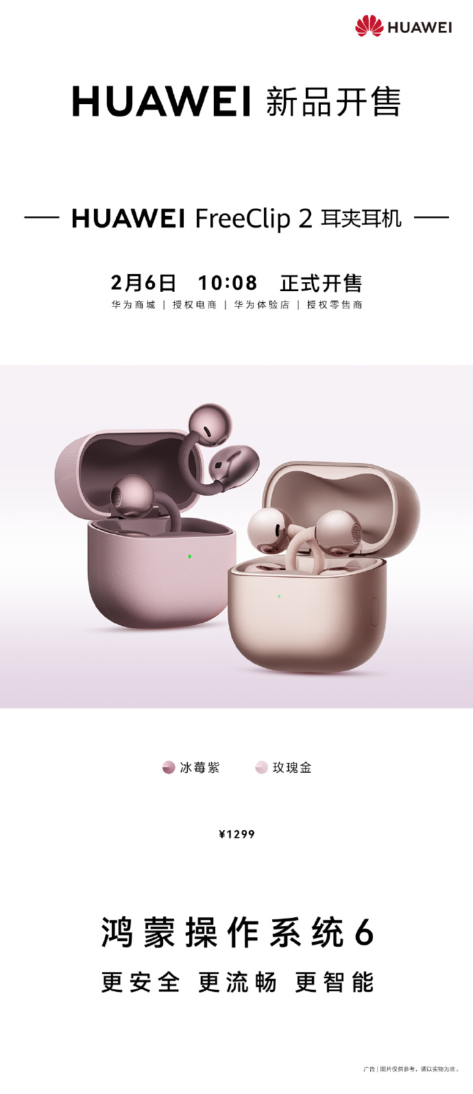 #华为FreeClip2耳夹耳机新色开售#迎新春焕新声,华为FreeClip 2玫瑰金、冰莓紫新色2月6日正式发售,将新年吉祥期许与前沿科技质感完美融合。玫瑰金自带温暖光泽,冰莓紫兼具高级感与氛围感,两款配色均适配新年多元穿搭,搭配星闪™音频技术的稳定流畅听感,既是颜值出众的时尚配饰,也是实力在线的听音利器,成为新年科技焕新的优选之作。#华为耳夹耳机新色开售首日火爆#