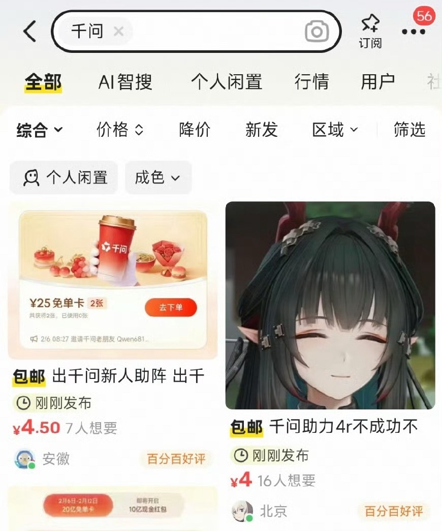 二手平台现千问新用户售价4元千问 免费奶茶咱不得不佩服有些人的脑子,这都能想到赚钱的商机。