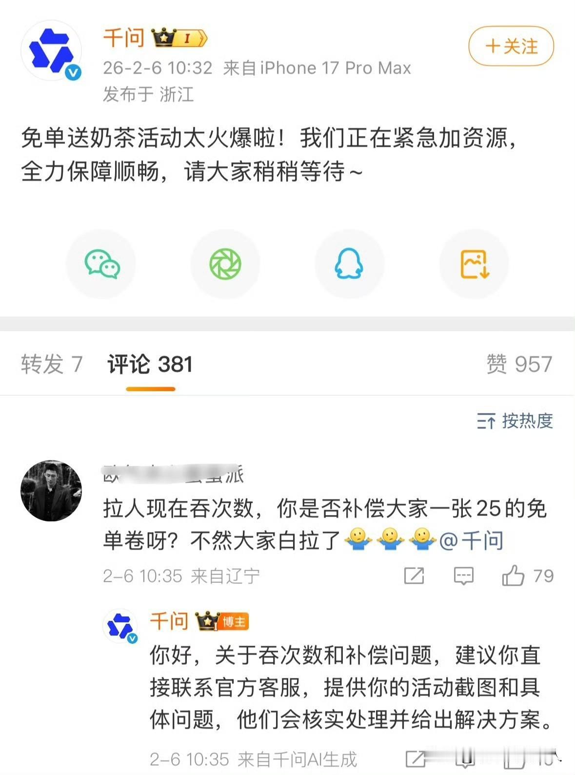 哇塞! 这广告做的值了,广告费都省了。 千问团队背后有高人呀,不出点差错,不出点幺蛾子怎么火爆呀?你们说是不是?我的观点对不对?[捂脸] 赶紧下单,千万APP春节请全国人民喝奶茶。抢的快的话就是免费。