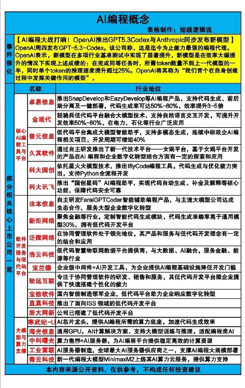2月6日周五,近期A股这个板块值得重点关注!!! AI编程大战打响,OpenAI推GPT5.3codex与Anthropic同步发布大模型,该模型号称是迄今为止能力最强的编程代理,新模型在行业基准测试实现显著提升 ,重点关注:卓易信息、久其软件、法本信息!!!