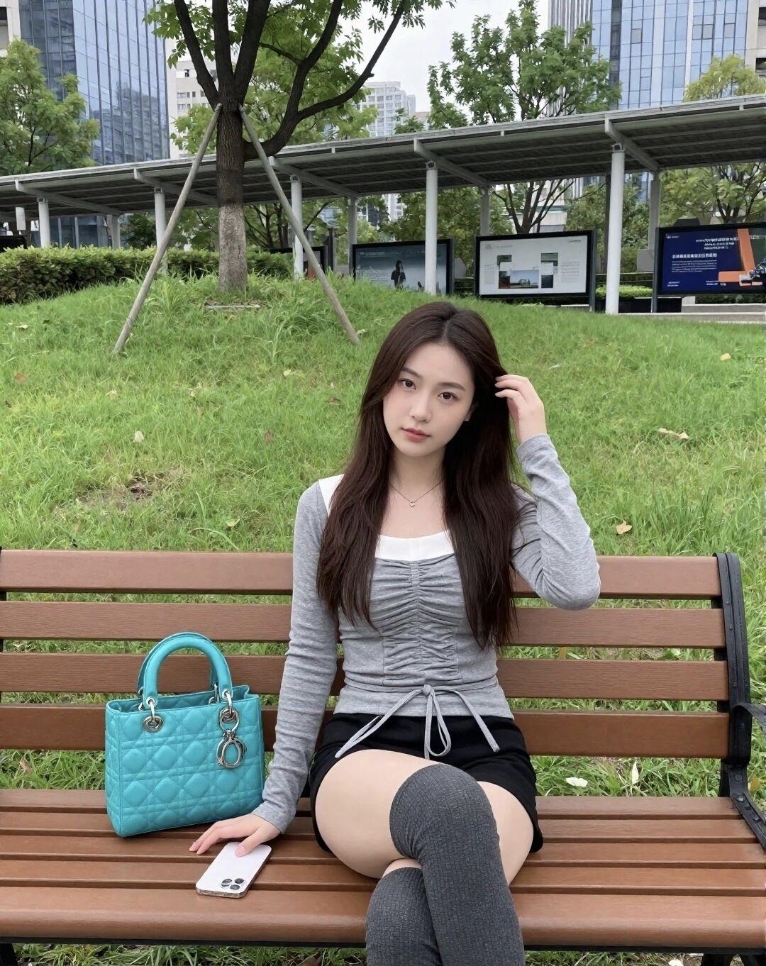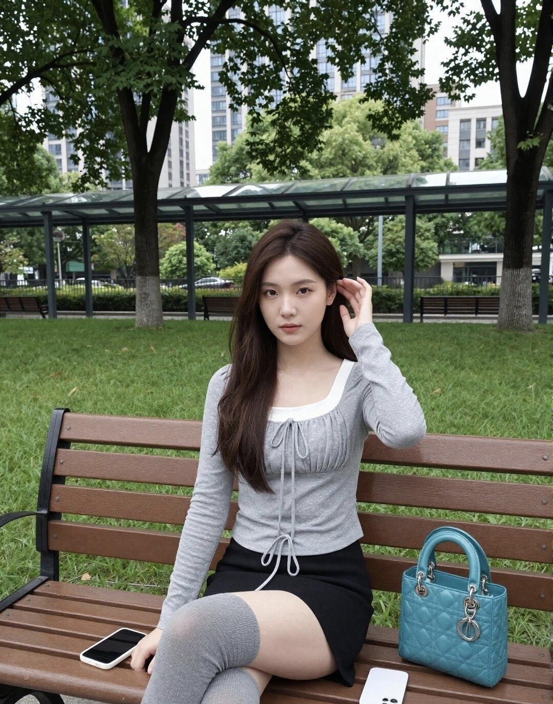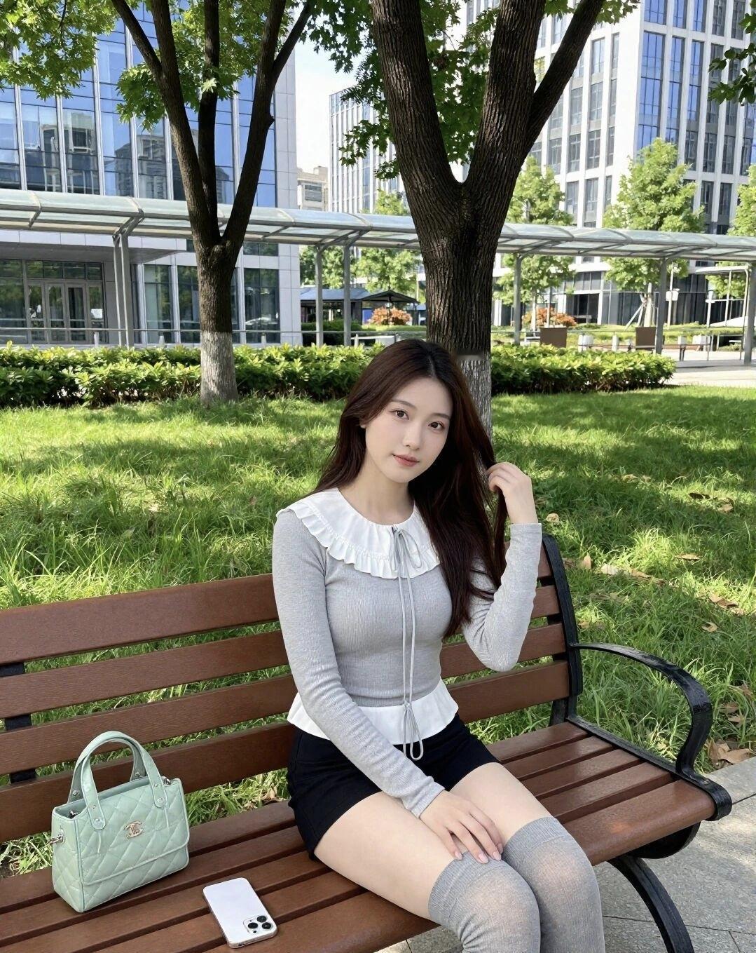 阳光明媚的午后,公园长椅上的甜美少女