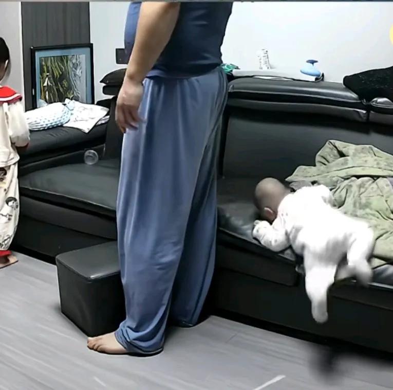 把转身与大宝说话,结果身后的小宝自己翻身不慎从沙发上摔下来, 爸爸吓得赶紧把小宝抱了起来, 并且说一岁不离人, 3岁不离手,心疼又自责, 怪自己没有看好, 网友说, 这小宝好大的劲, 自己都能翻身坐起来, 肯定摔的不轻, 脑袋瓜子嗡嗡的, 这看孩子真的是有耐心, 必须一刻不能离开。