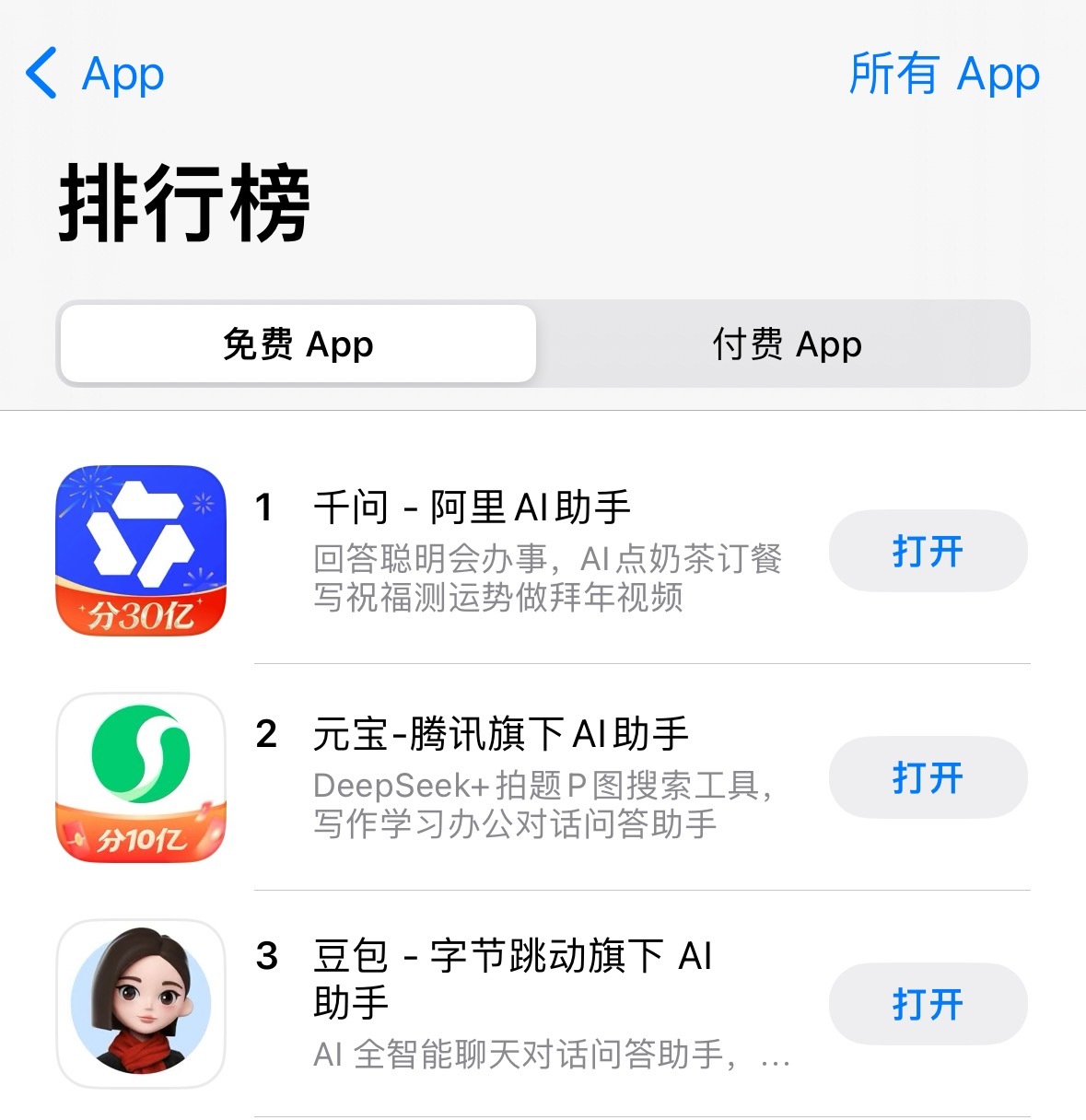 千问冲上苹果商店免费榜第一果然啊,今天这么一搞直接就登顶了,目前排名前三的分别是三个AI:千问,元宝,豆包。